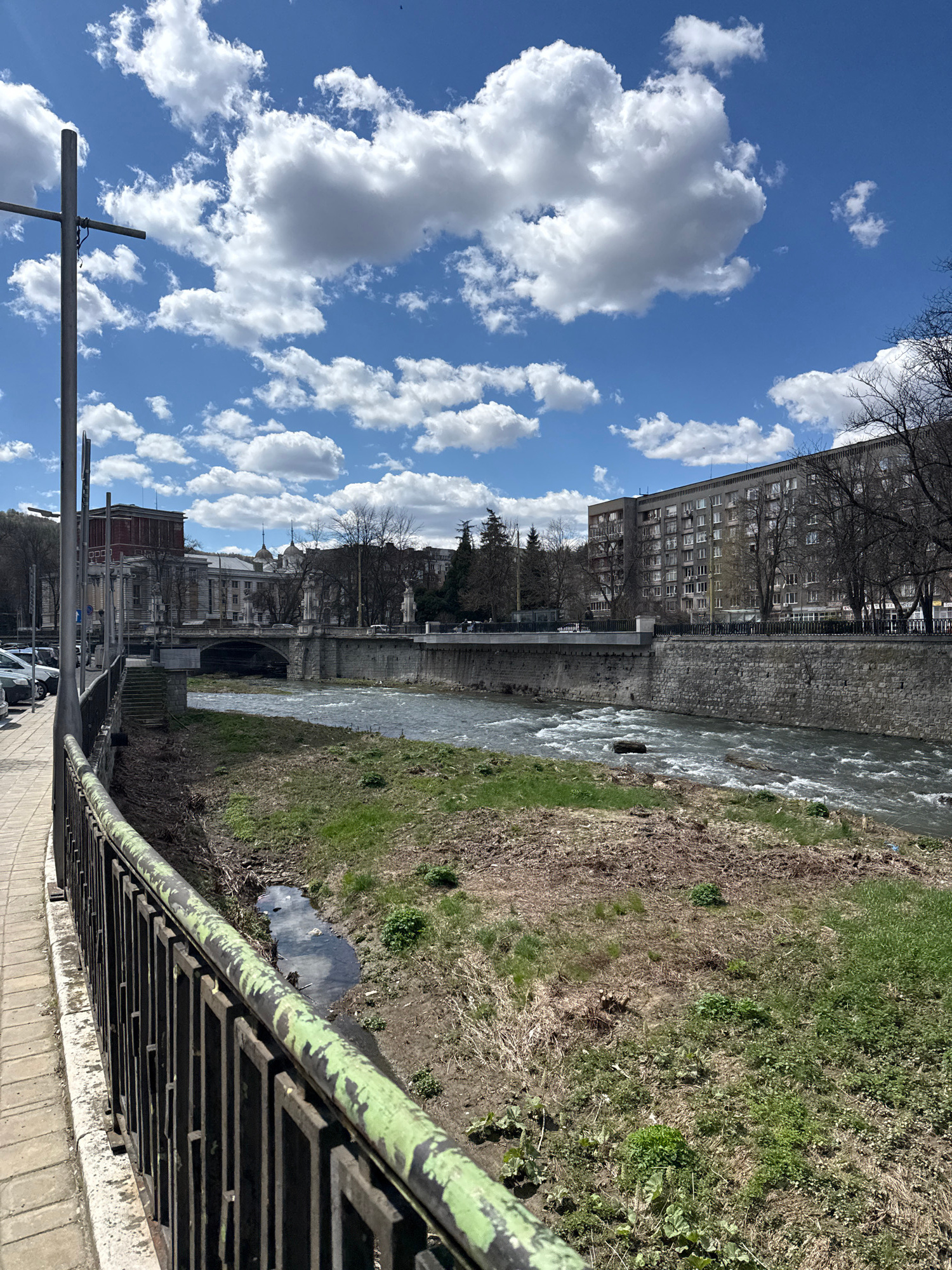 The image shows a scene in Gabrovo, Bulgaria. A river flows through the city, with stone embankments on either side. A building with multiple windows is situated next to the river on one side. On the…read more