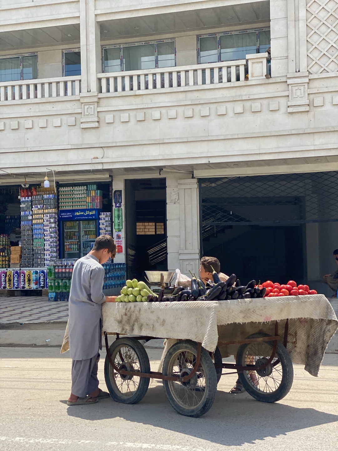 The image depicts a street scene in Kandahar, Afghanistan. Two young men are tending to a four-wheeled cart laden with produce. The cart displays a variety of vegetables, including light green squash,…read more