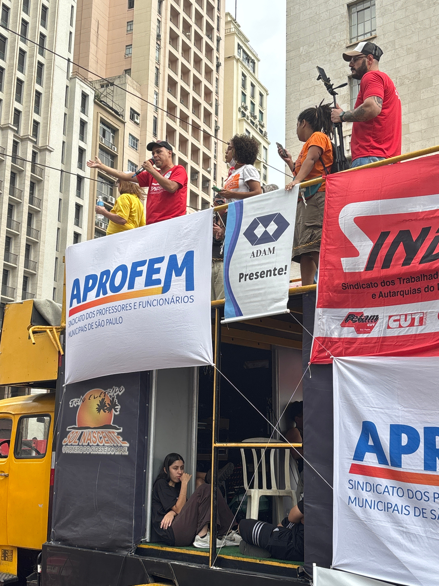 The image shows a gathering in what appears to be the city of São Paulo, Brazil. The view is taken from a lower angle, looking up at the side of a yellow truck platform, from which multiple banners ha…read more