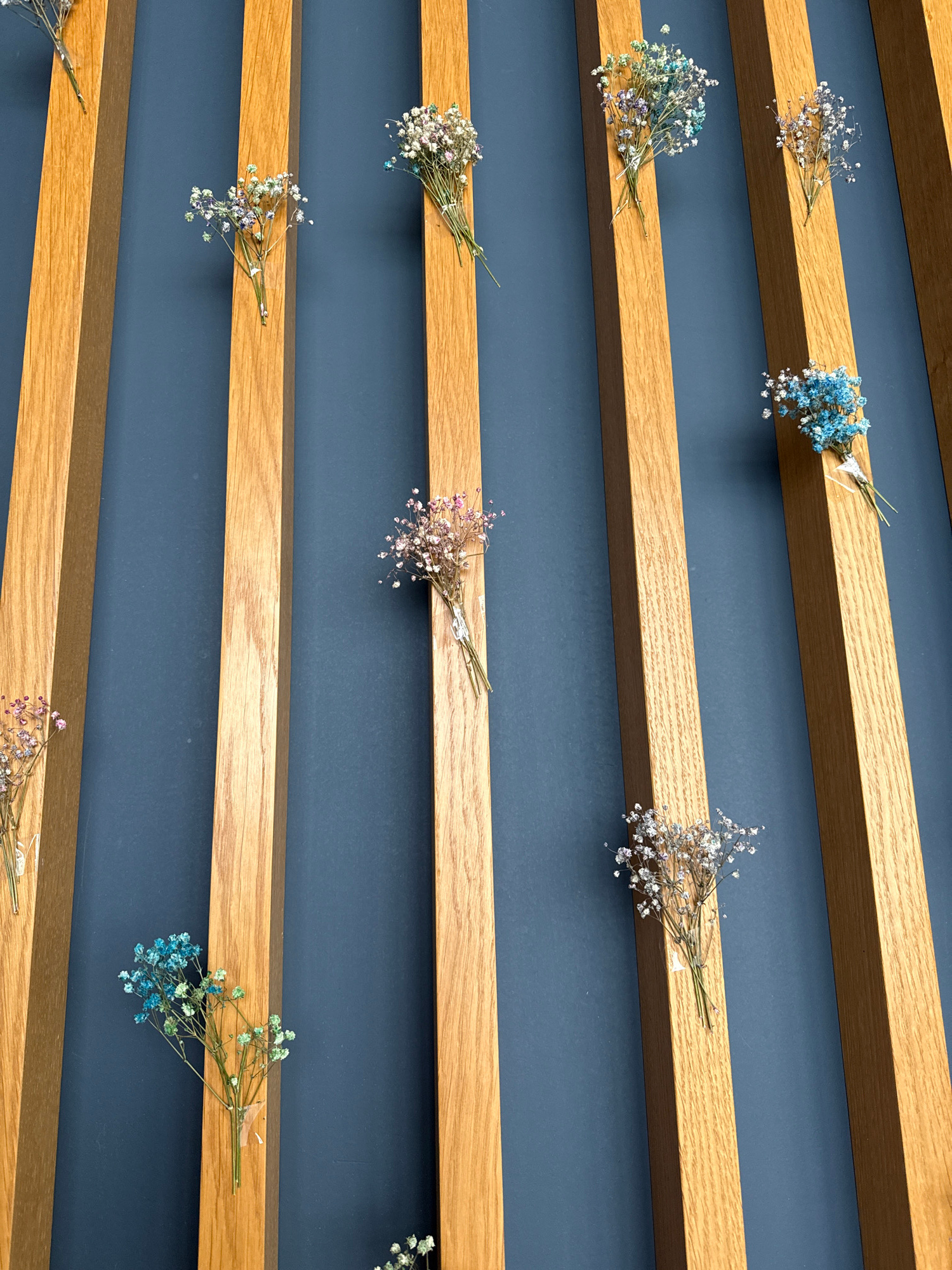 The image shows a wall decoration. Horizontal wooden planks are mounted on a dark blue wall. Small bunches of baby's breath flowers in various colors (white, blue, pink) are attached to the planks. Th…read more