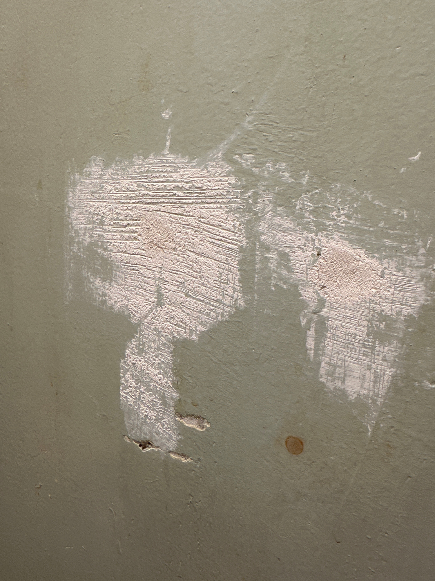 The image shows a wall with patches of spackle or filler. The filler is white and has distinct scoring or scratching marks. The surrounding wall is painted a muted green or gray-green color. There is…read more