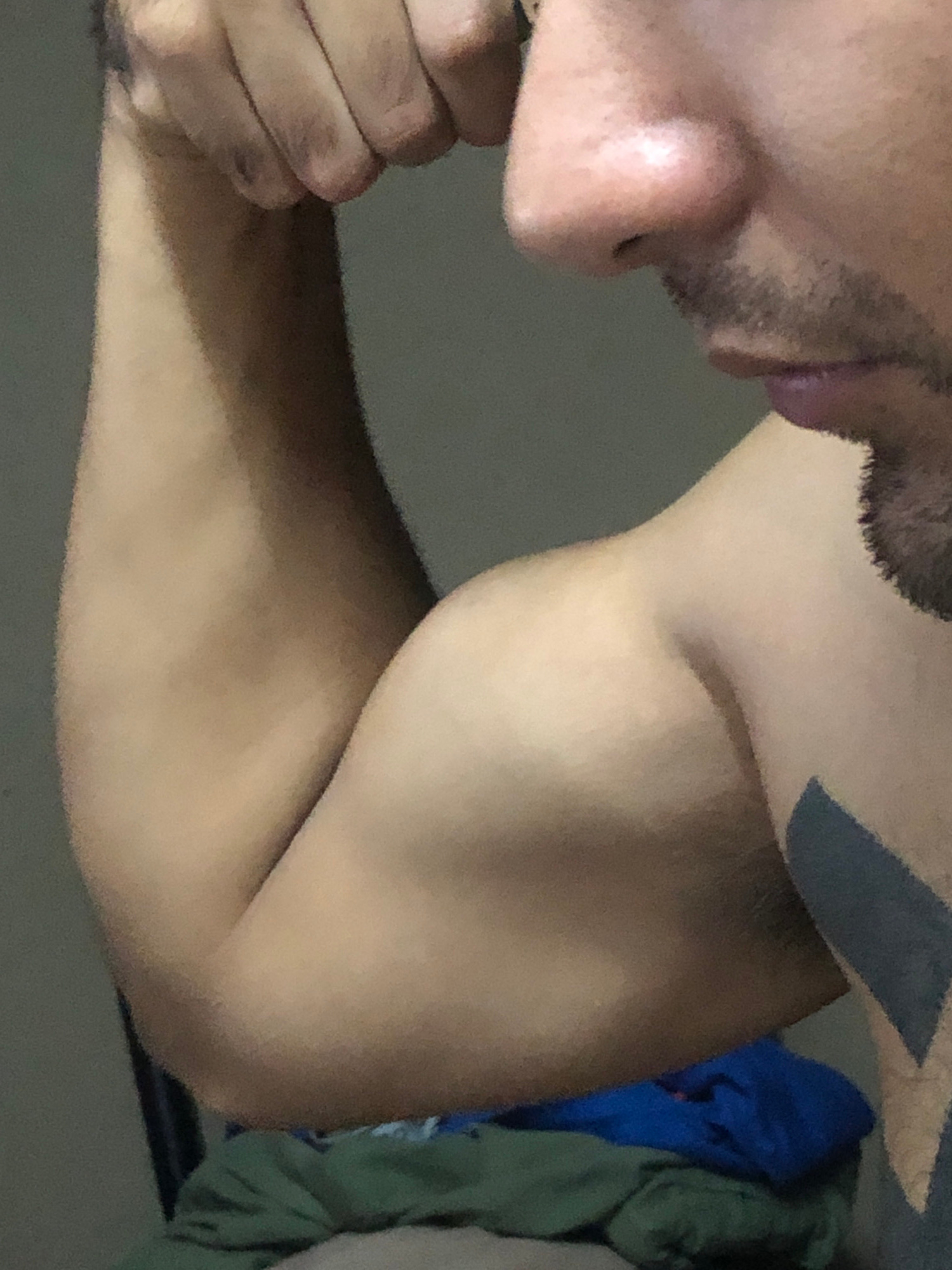 A close-up shot presents a person's face from the nose down to the jawline, along with a flexed right arm exhibiting a prominent bicep. The individual has a stubble beard. The arm appears to have a ta…read more