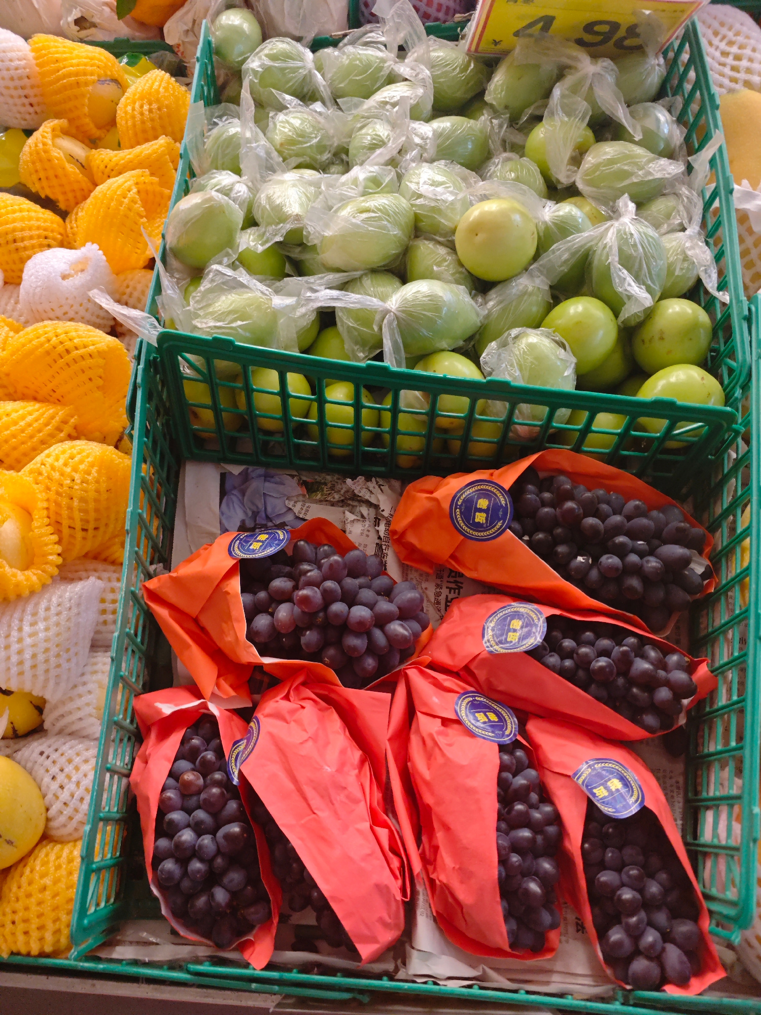 A market scene in Chongqing High-tech Zone, China. A green plastic basket is filled with red paper pouches containing dark grapes, each pouch sealed with a blue and gold sticker. Above, a smaller gree…read more