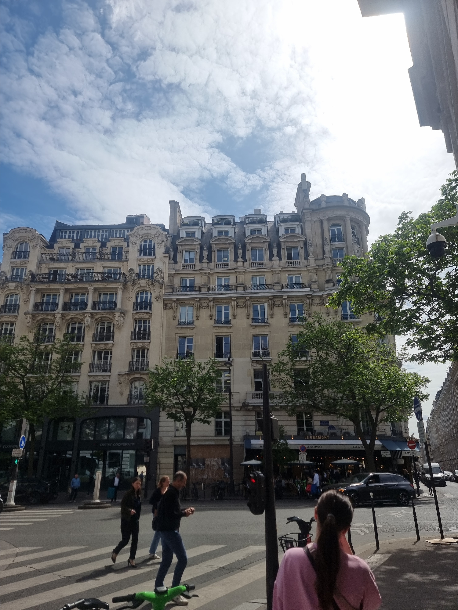 This is a daytime urban street scene in Paris, France, showing a bustling sidewalk and a grand, ornate building under a partly cloudy sky. The image is taken from a slightly low angle, looking up at t…read more