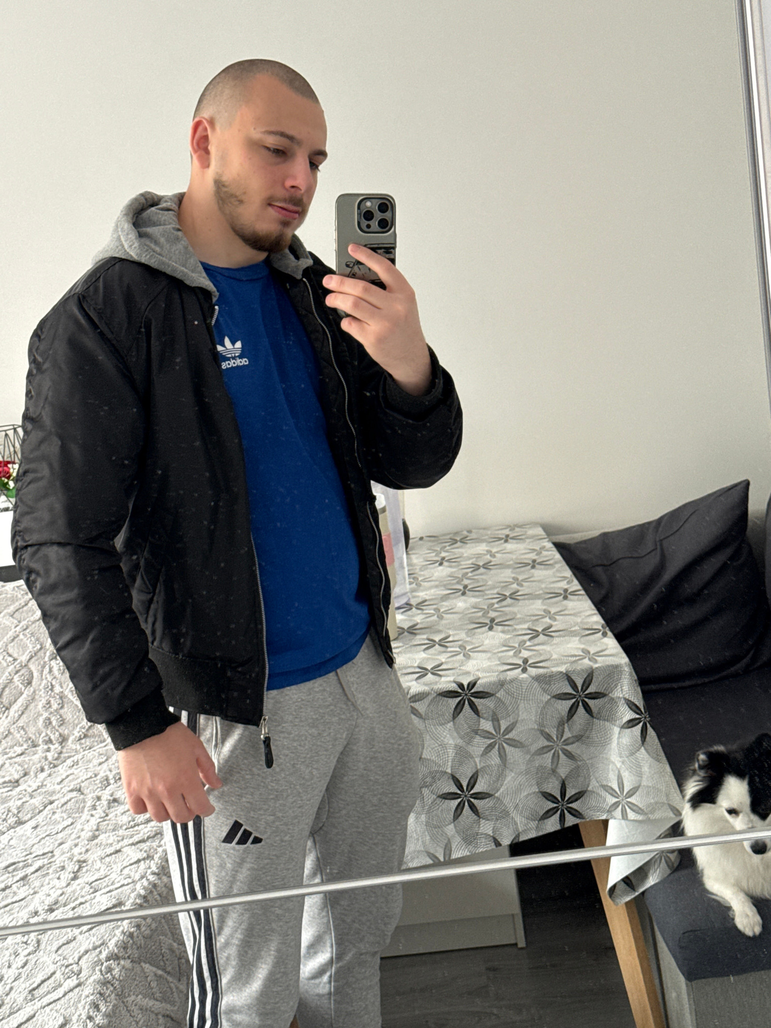 A person takes a selfie in a mirror, wearing a blue Adidas shirt, grey sweatpants with three stripes, and a black bomber jacket with a grey hood. The location is possibly an apartment in Stara Zagora,…read more