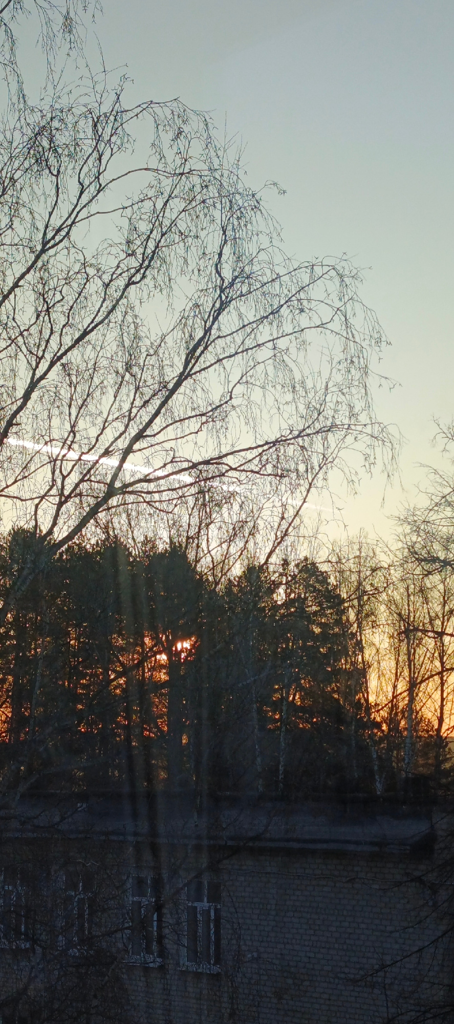 The image depicts a view from a building in Chaikovsky, Russia, overlooking a forest at sunset. The foreground features bare tree branches silhouetted against the sky. Below the trees, the roof and up…read more