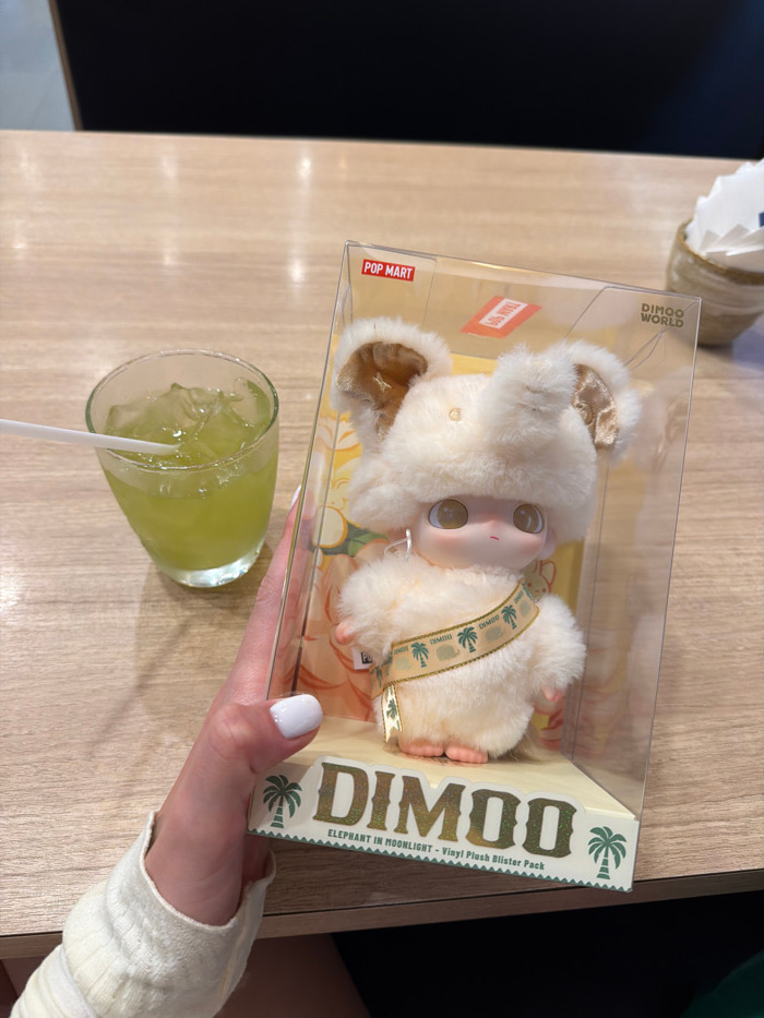 The image depicts an indoor scene on a light brown, wooden-grained table. A fair-skinned hand with white-painted nails, wearing a light-colored long-sleeve garment, holds a clear plastic box containin…read more