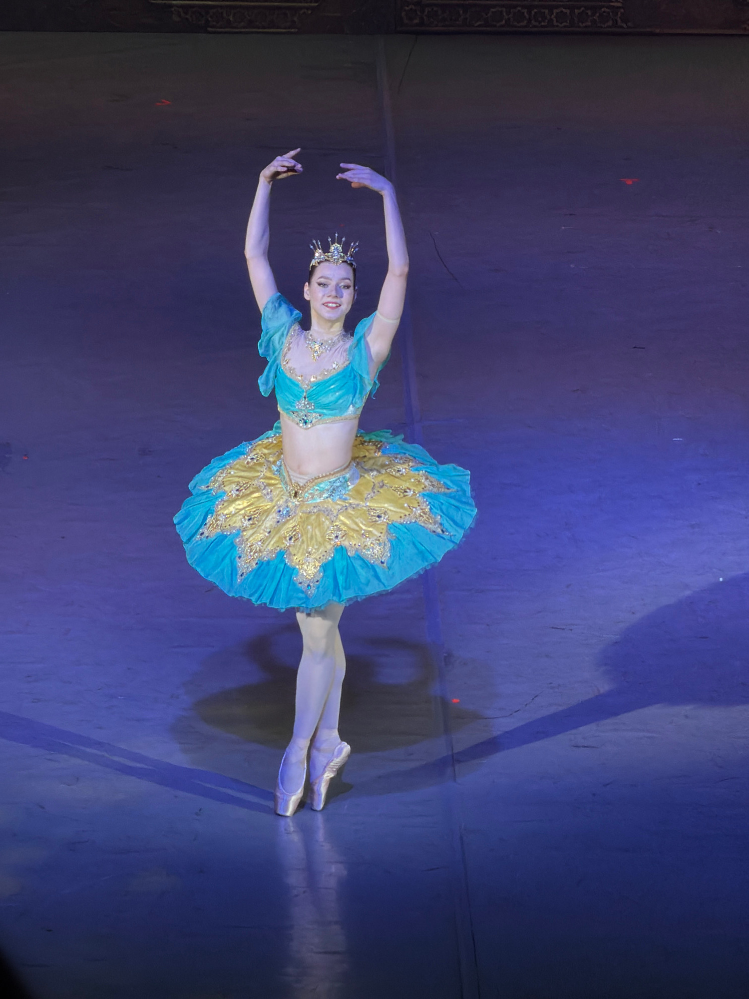 A ballerina in a light blue and gold tutu is performing on a stage. The stage is dimly lit with blue light, casting shadows on the surface. The ballerina is wearing a tiara and jewelry, and her arms a…read more