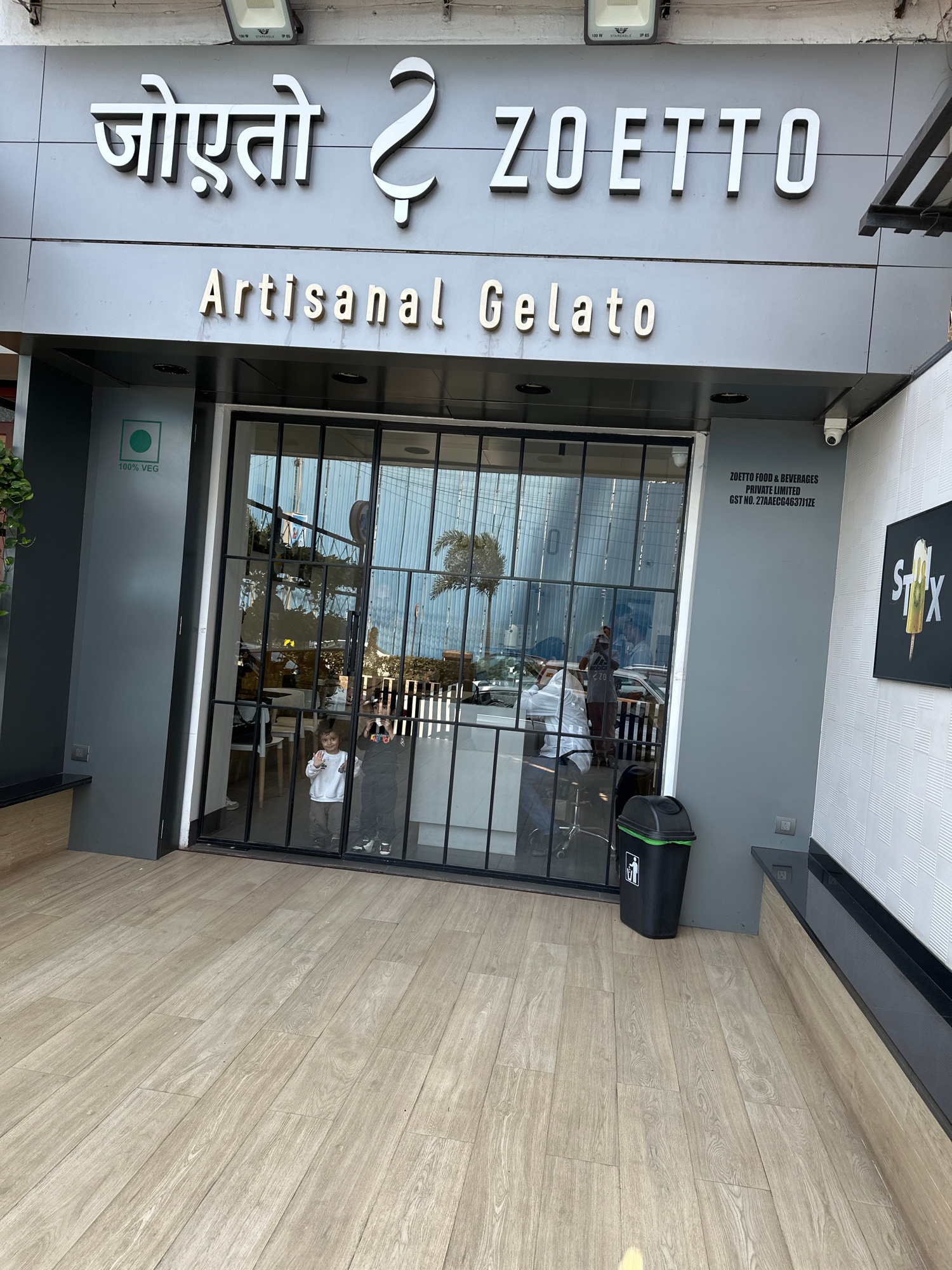 The image depicts the front facade of "Zoetto Artisanal Gelato," a dessert shop in Mumbai, India. The signage includes the name in English and a Devanagari script, along with the tagline "Artisanal Ge…read more