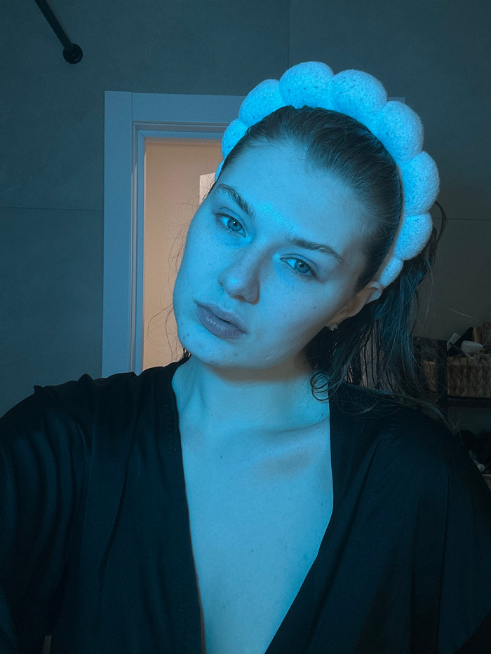 A young woman wearing a puffy white headband poses at a slight angle. She has fair skin, light eyes, and her hair is pulled back. She's wearing a dark top. The lighting is cool and blue. A window with…read more