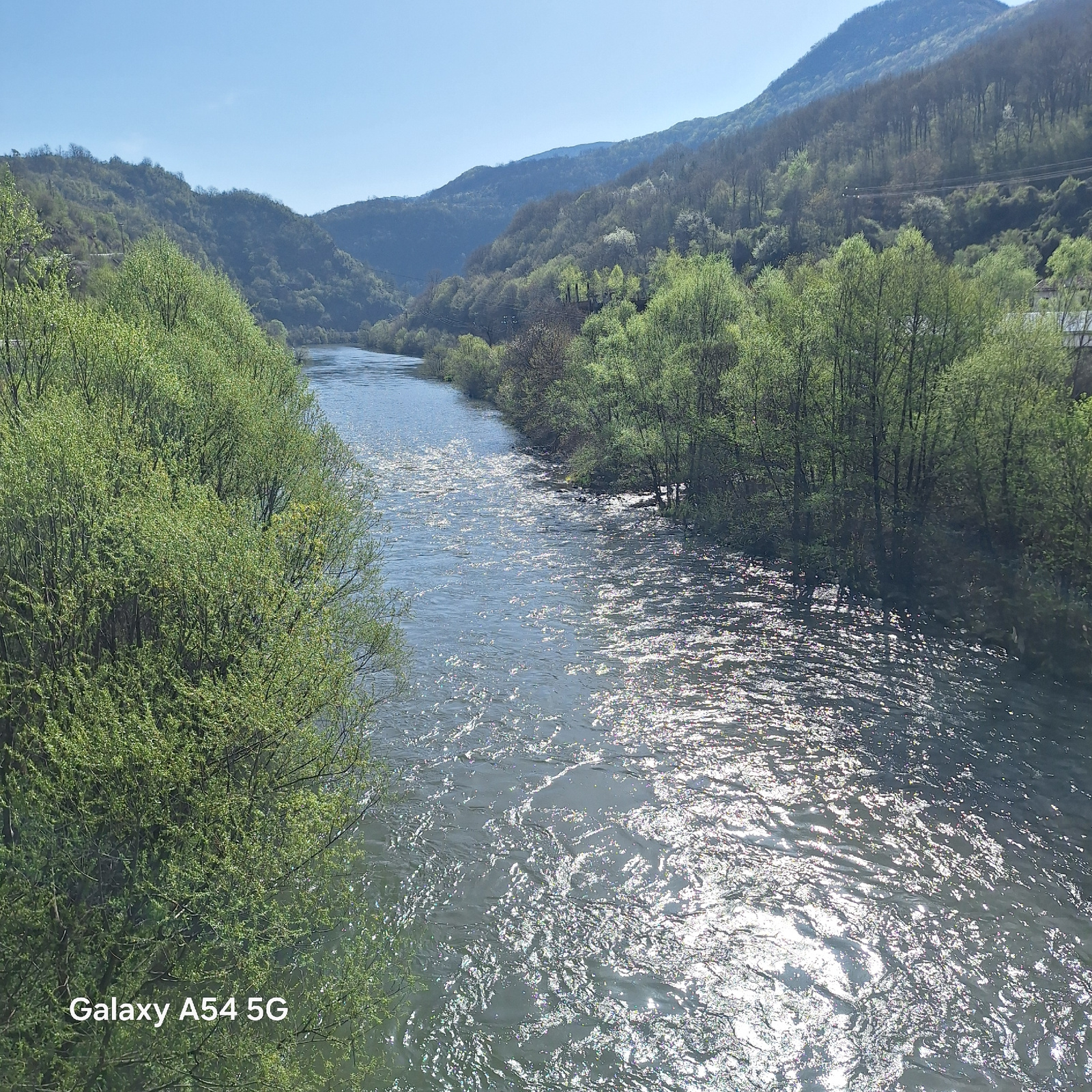 A vibrant landscape photograph captures a wide river flowing through a lush, mountainous valley. The river, occupying the central and right portions of the image, glitters intensely with bright sunlig…read more