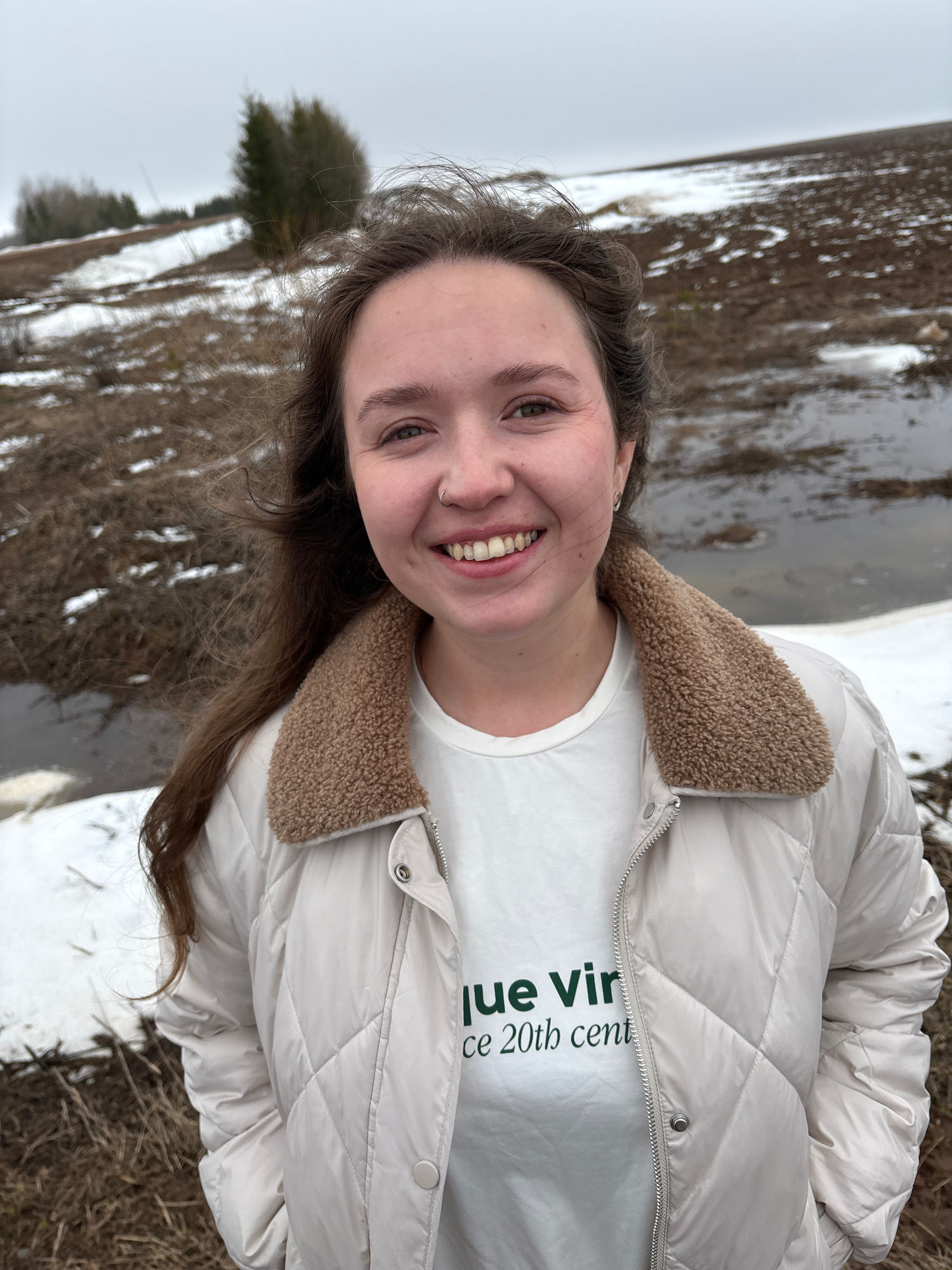 A young woman is smiling at the camera outdoors. She wears a white t-shirt with green text, a white quilted jacket with a tan fleece collar, and has dark curly hair. The surrounding environment includ…read more