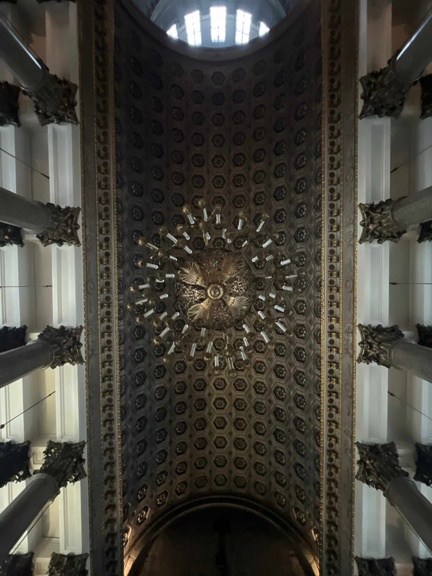 The image depicts an ornate ceiling with a large chandelier in the center, likely taken inside a historic building. The ceiling features a pattern of hexagonal shapes, each containing a floral design.…read more