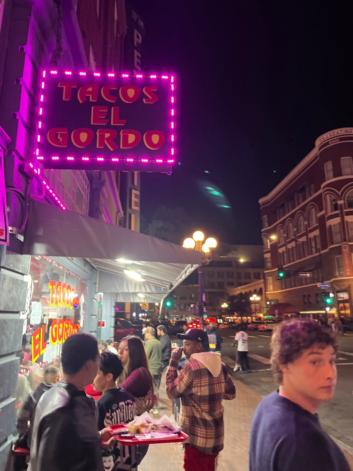 A nighttime urban scene featuring a vibrant "Tacos El Gordo" sign illuminated in pink neon. People are lined up at a food stand, their faces illuminated by the stand's glow. A person with purple hair…read more
