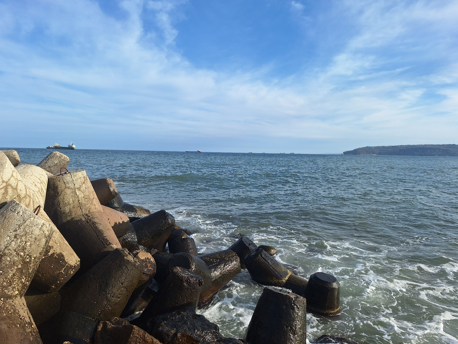 The image depicts a coastline scene in Varna, Bulgaria, dominated by concrete tetrapods. These structures are clustered together in the foreground, with some partially submerged in the water. The sea…read more