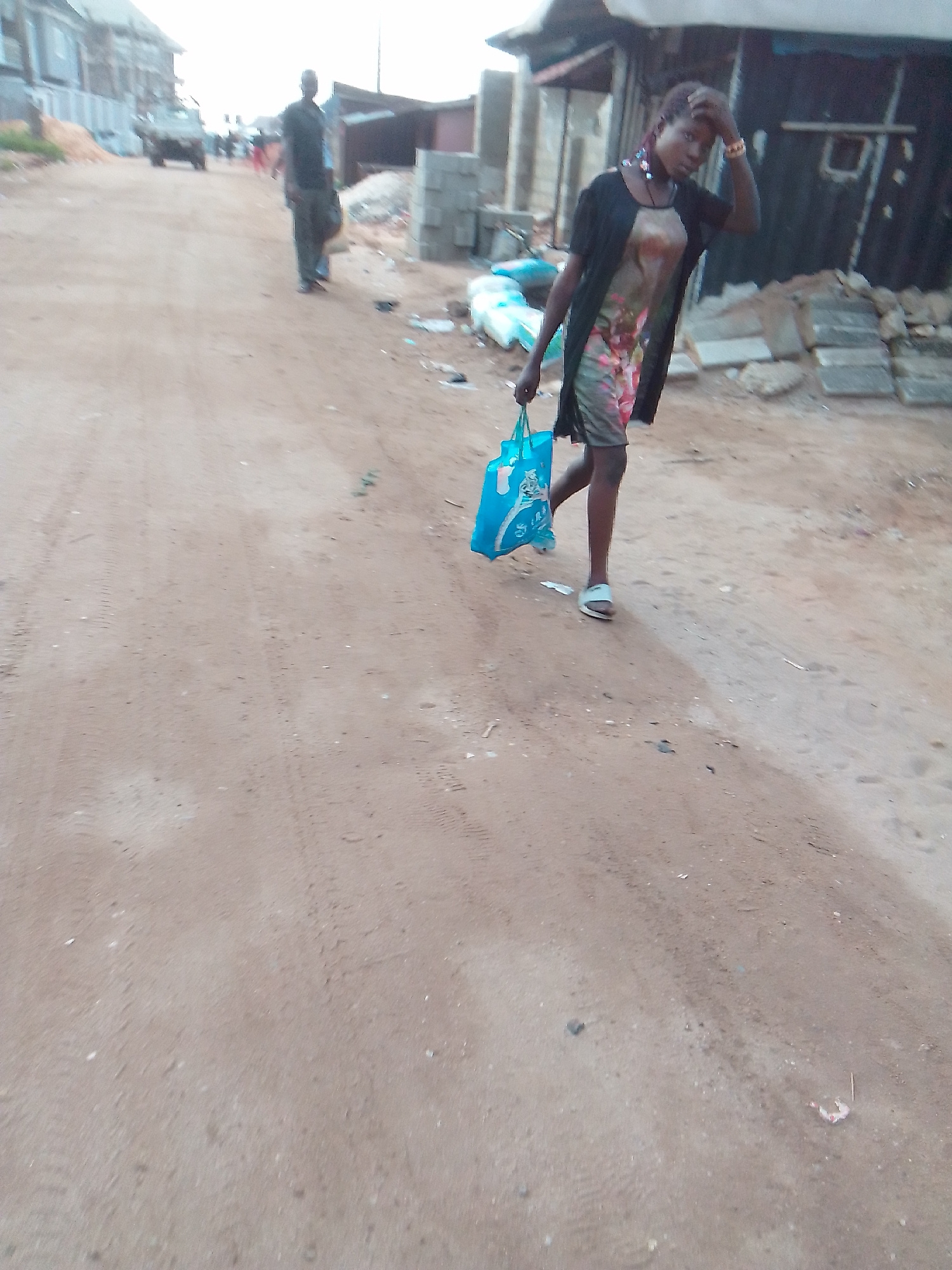 The image shows a young woman walking on a sandy road in Owerri, Nigeria. She is carrying a blue shopping bag and has her hand on her forehead. She is wearing a floral dress, a black cardigan, and whi…read more