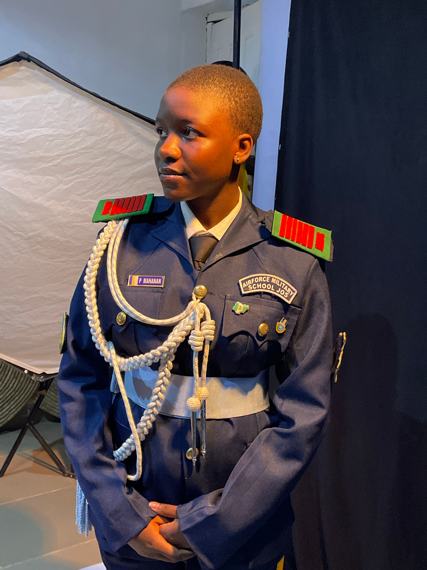A young individual, likely female, with a closely cropped hairstyle, is depicted in a formal portrait, possibly taken in a studio setting. She wears a dark blue military-style uniform jacket with a li…read more