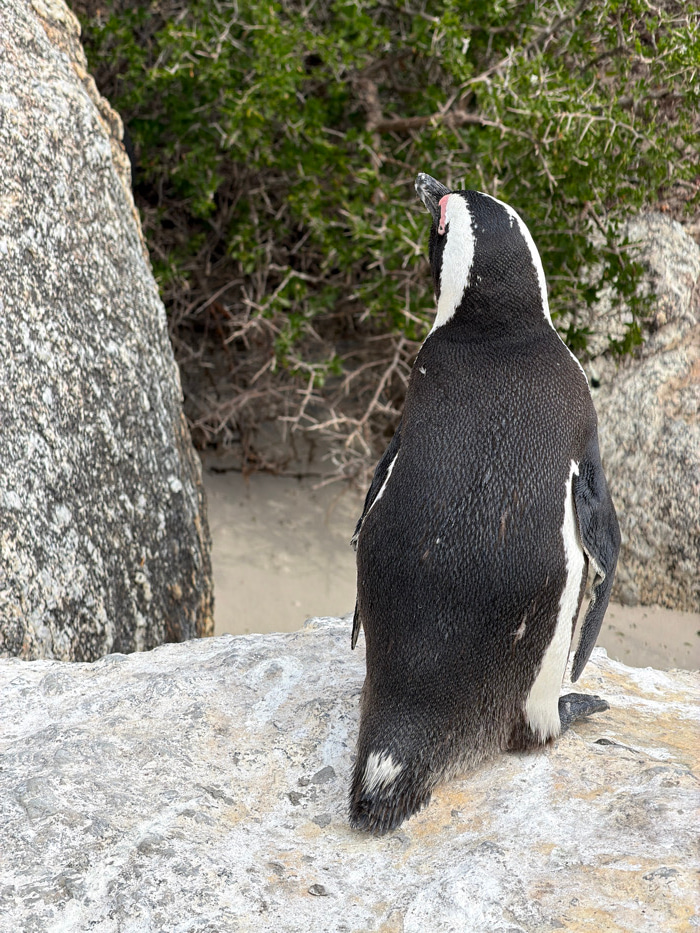 A single African Penguin (Spheniscus demersus) is observed from a rear-elevated perspective, standing atop a large, light-colored granite boulder. The penguin's dorsal side exhibits dense, black pluma…read more