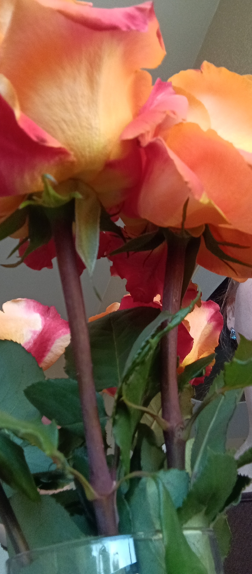 The image presents a close-up, upward-angled view of a bouquet of roses, emphasizing their vibrant colors and natural details. The primary subjects are several roses, each displaying petals that gradu…read more