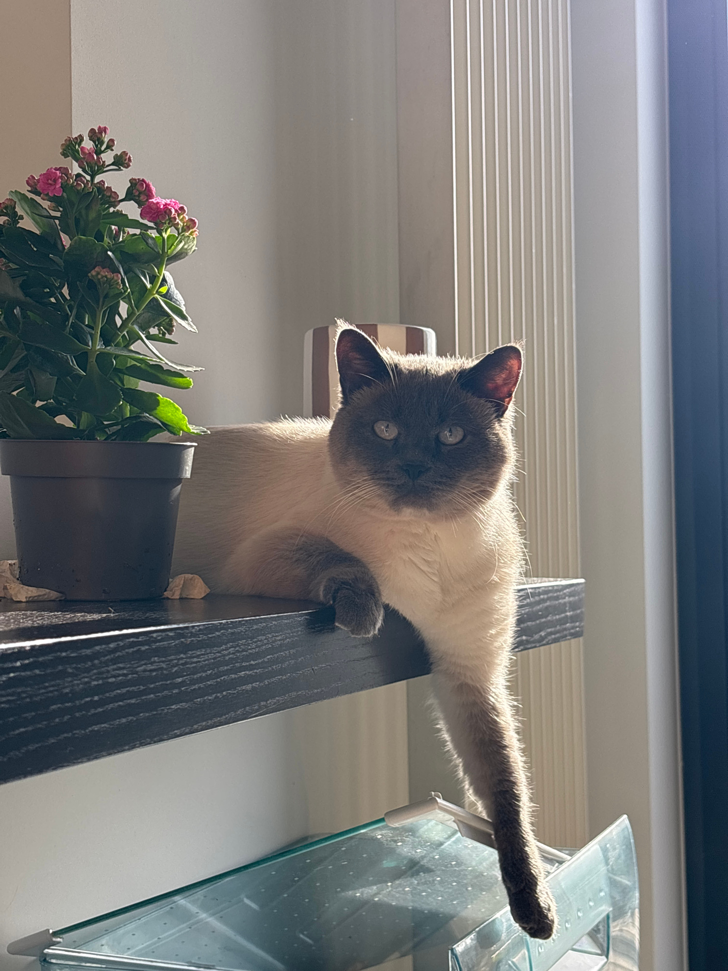 A Siamese cat is perched on a dark, vertical structure with a potted plant below. The plant has green leaves and small pink flowers. The cat is cream and grey, with a dark mask and tail, and is lookin…read more