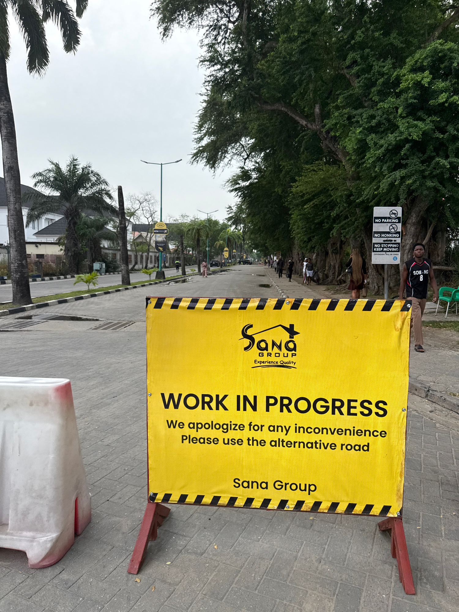 The image displays a street scene in Lekki, Nigeria, featuring a large yellow banner indicating "WORK IN PROGRESS" prominently in the foreground on the right. The banner reads: "WORK IN PROGRESS", "We…read more