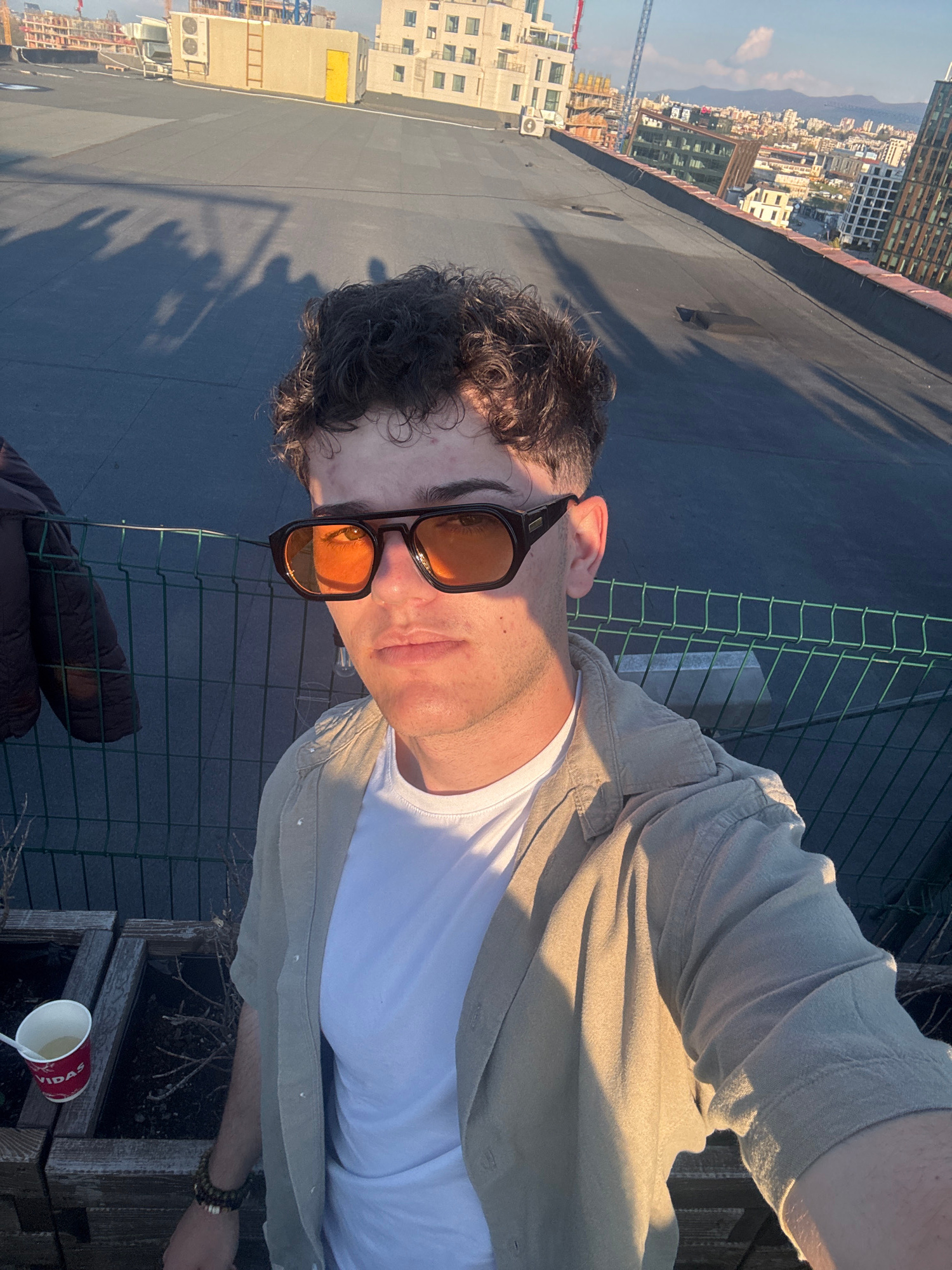 A selfie taken from a high vantage point in Sofia, Bulgaria. A man with short, dark, curly hair and wearing amber-tinted sunglasses is the primary subject. He wears a white t-shirt and a light-colored…read more