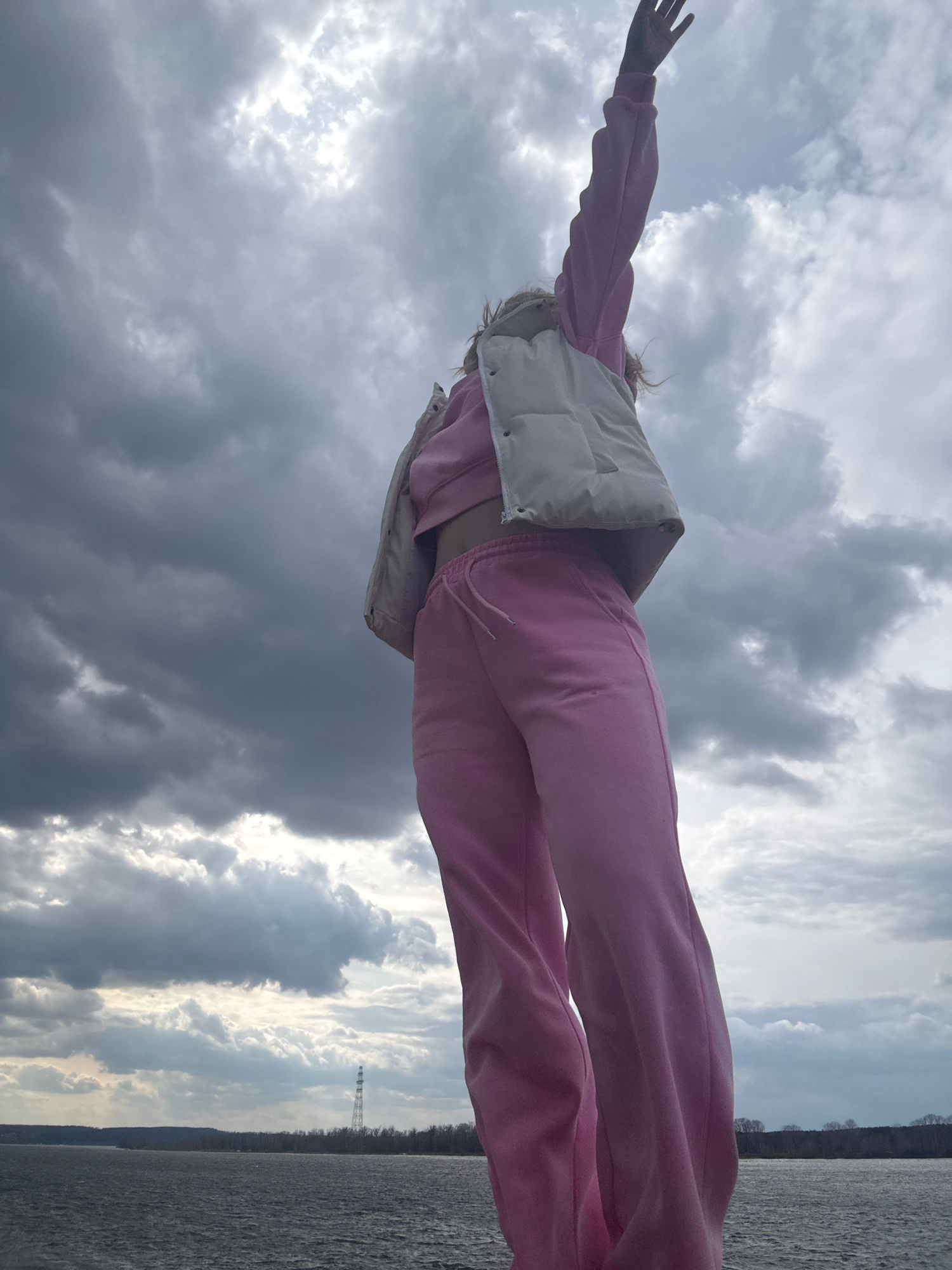 The image, originally oriented 90 degrees clockwise, depicts a person with outstretched arms against a dramatic sky and waterscape. When viewed upright, the subject, likely female, is seen from a low…read more