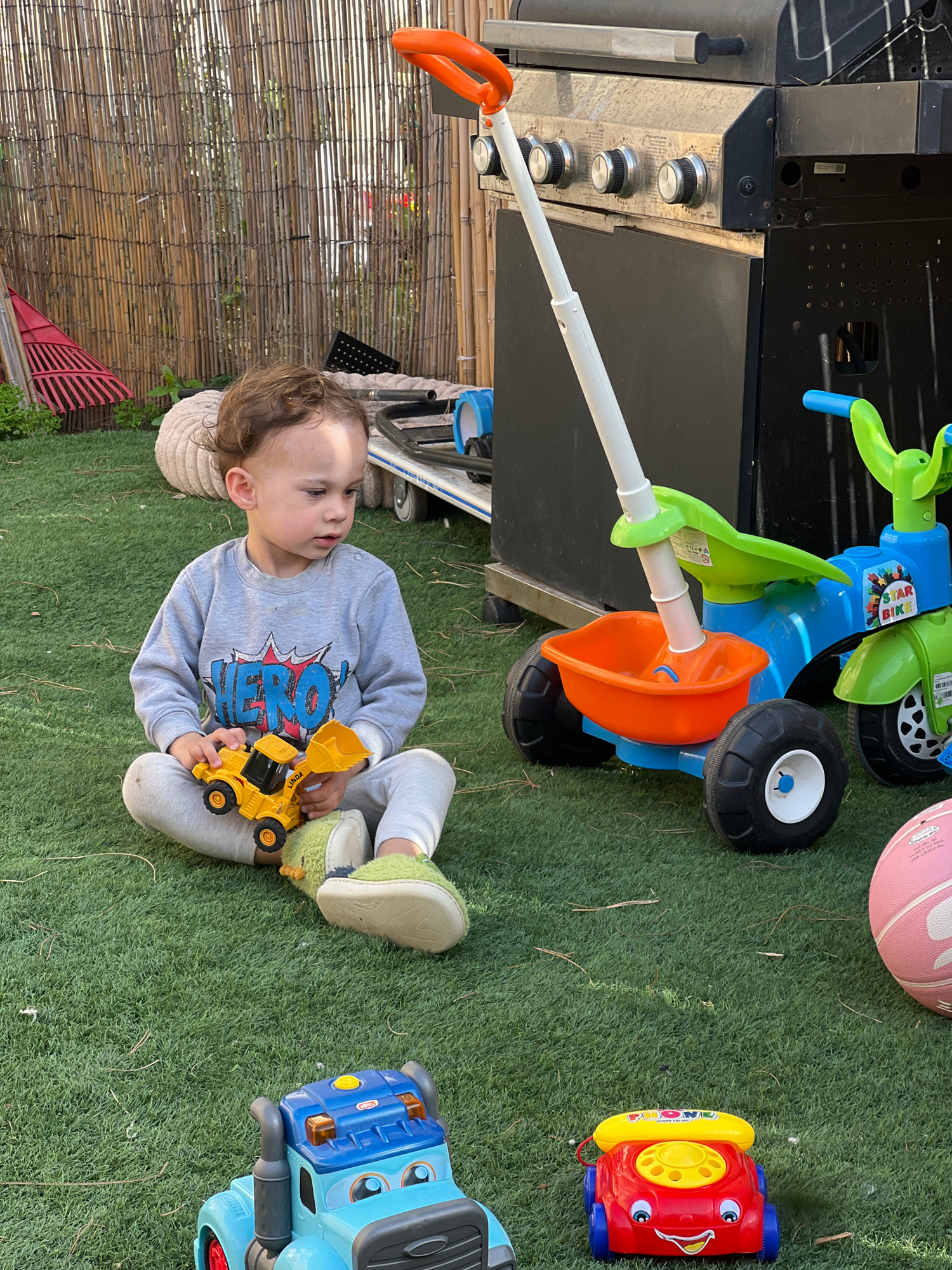 A young child is lying on artificial grass next to an outdoor grill and various toys. The child is wearing a gray long-sleeved shirt and gray pants and green fuzzy slippers. The child is holding a yel…read more