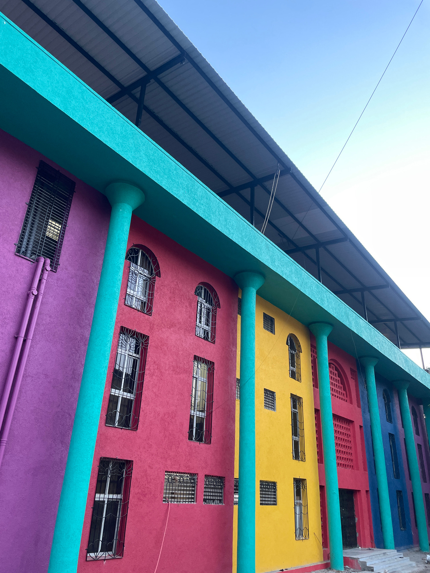 From a low angle, a multi-storied building in Mumbai, India is seen. The building’s facade is divided into horizontal bands of color. From the bottom up, the colors are purple, red, yellow, and blue.…read more