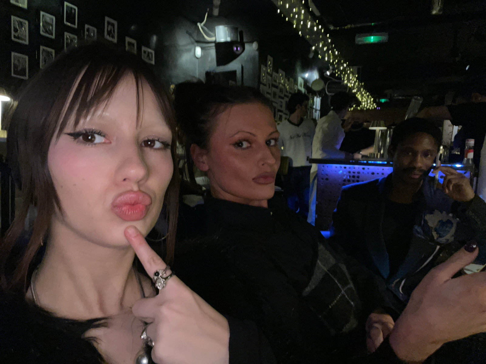 The image shows a group of people in what appears to be a bar or restaurant setting in London, United Kingdom. Two women are in the foreground, one with dark brown hair styled with bangs, making a pou…read more