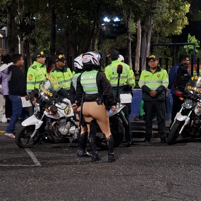 A group of uniformed traffic police officers on motorcycles are positioned in a line. Each motorcycle displays the word "TRANSITO". Most officers are wearing reflective lime green jackets and dark tro…read more