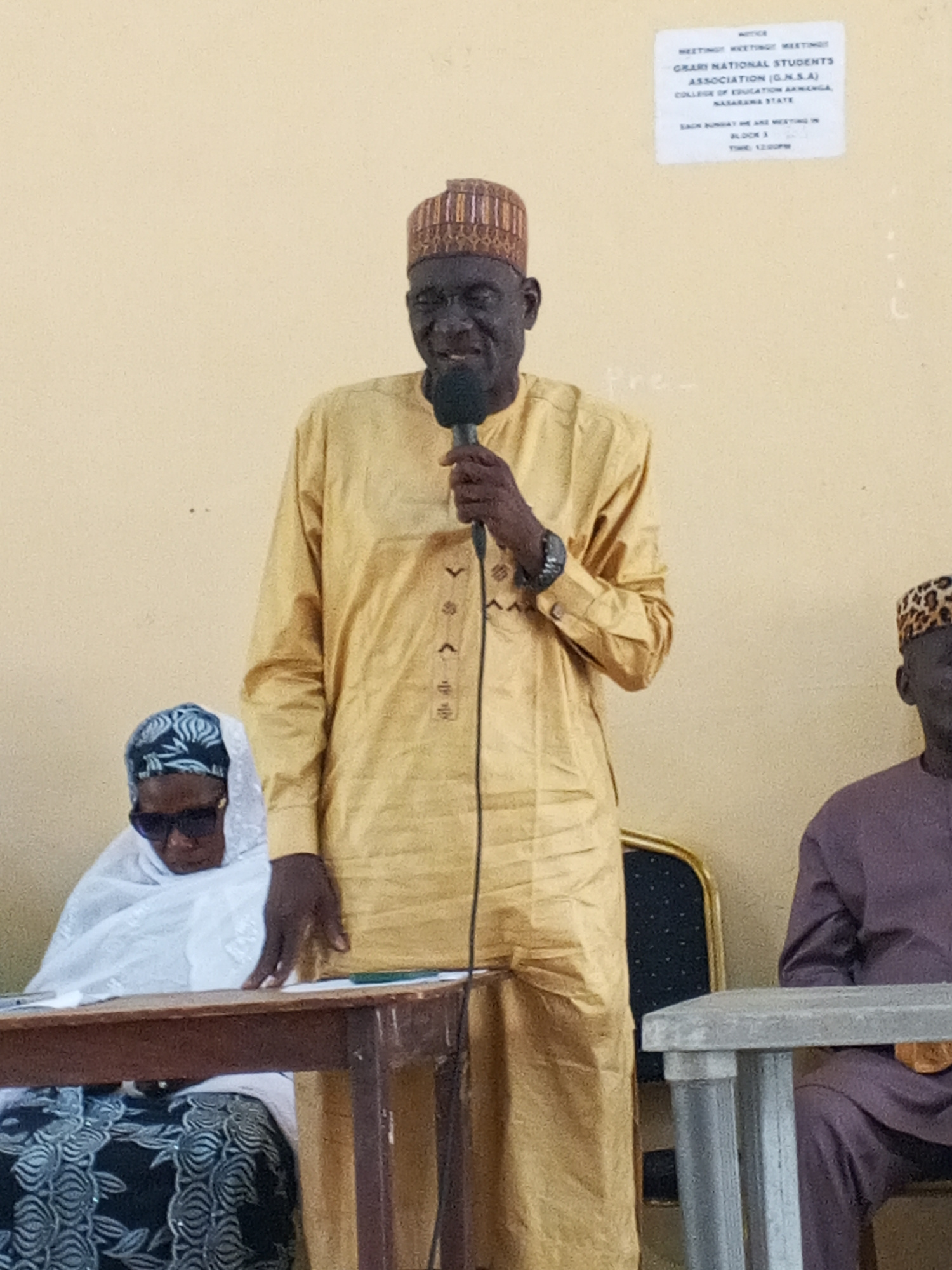 The image shows an indoor scene. A man in a gold tunic and patterned hat speaks into a microphone. He is positioned in front of a light-colored wall with a posted notice: "MEETINGT MIKETING MARTINOS,…read more