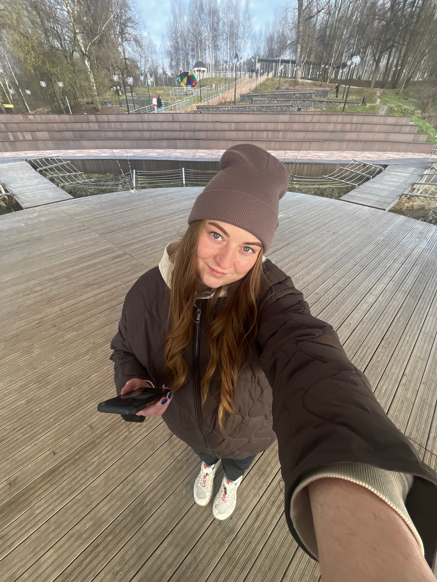 A young woman takes a selfie in Klin, Russia. She stands on a wooden deck, wearing a brown hat and jacket. In the background is a park with trees and a colorful umbrella structure. She holds a phone i…read more