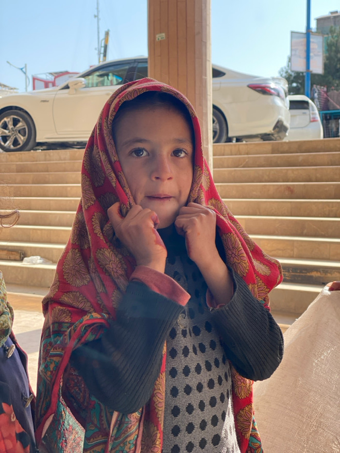 A young girl, approximately 6-10 years old, is depicted in a medium close-up, facing forward, against an outdoor urban background in Kandahar, Afghanistan. She has dark hair and eyes, and a fair compl…read more