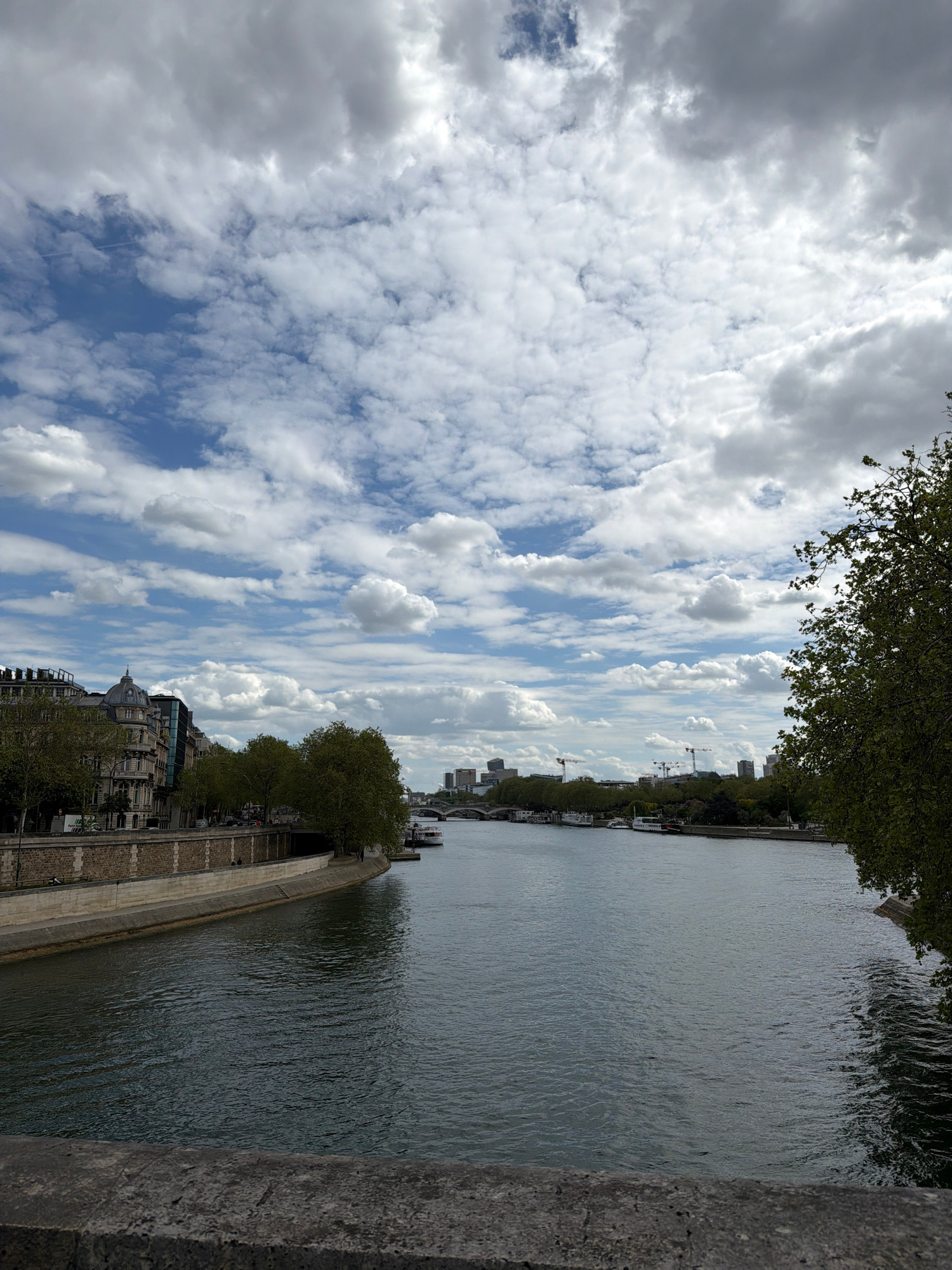 An outdoor, horizontal shot captures a view over a wide river, likely the Seine in Paris, France, under a partly cloudy sky. The perspective is from a slightly elevated position, possibly from a bridg…read more