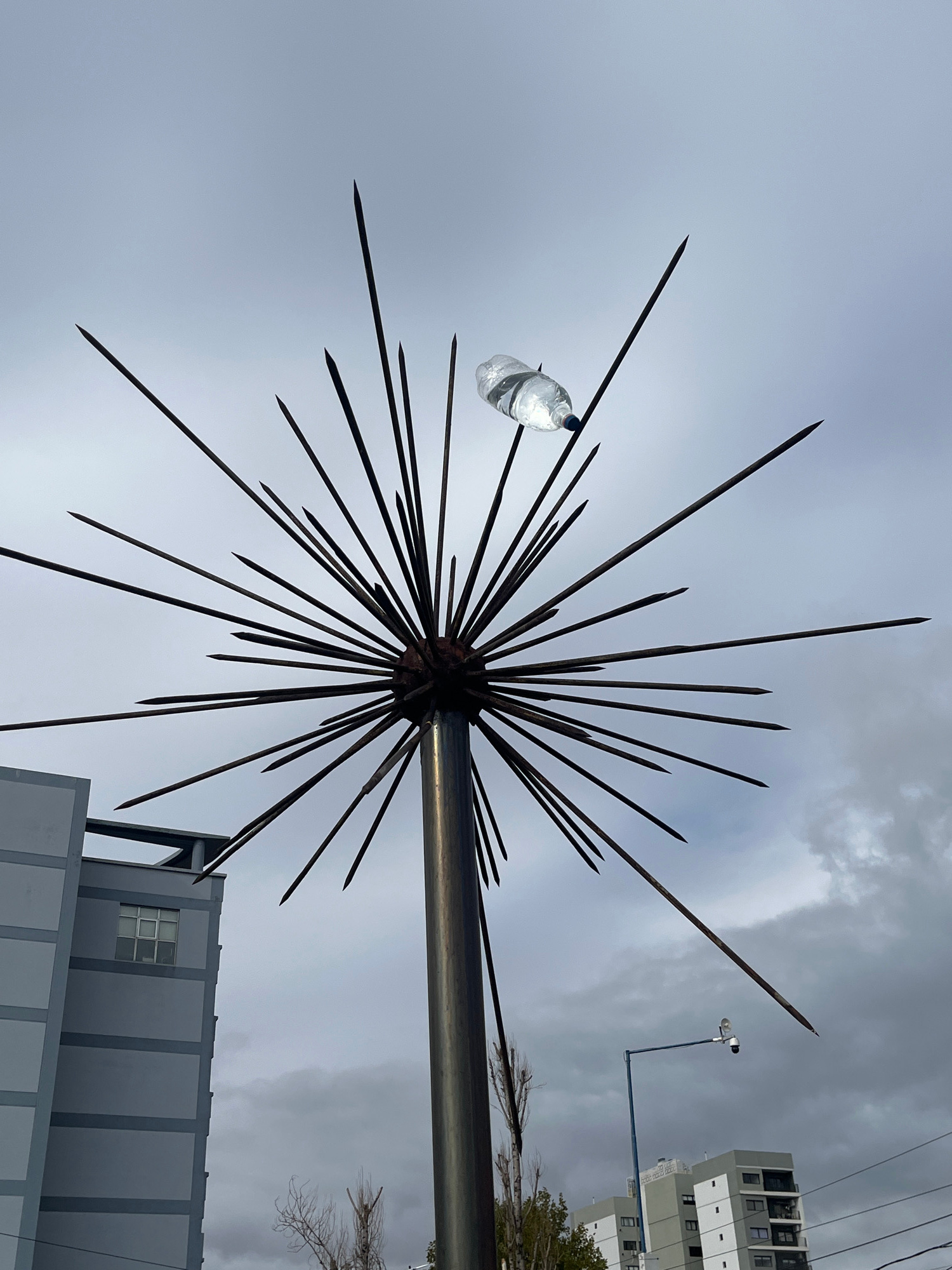 The image presents an upward view of a striking, dark metallic structure against an overcast sky, taken in Avellaneda, Argentina. The central object is a large, starburst-like sculpture or anti-perchi…read more