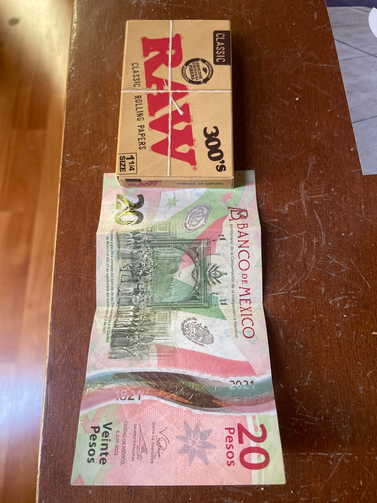 The image shows a box of RAW brand rolling papers, a 20 Mexican Peso bill, and a wooden surface. The rolling papers are a light brown color with red lettering. The 20 Peso bill is green, pink, and whi…read more