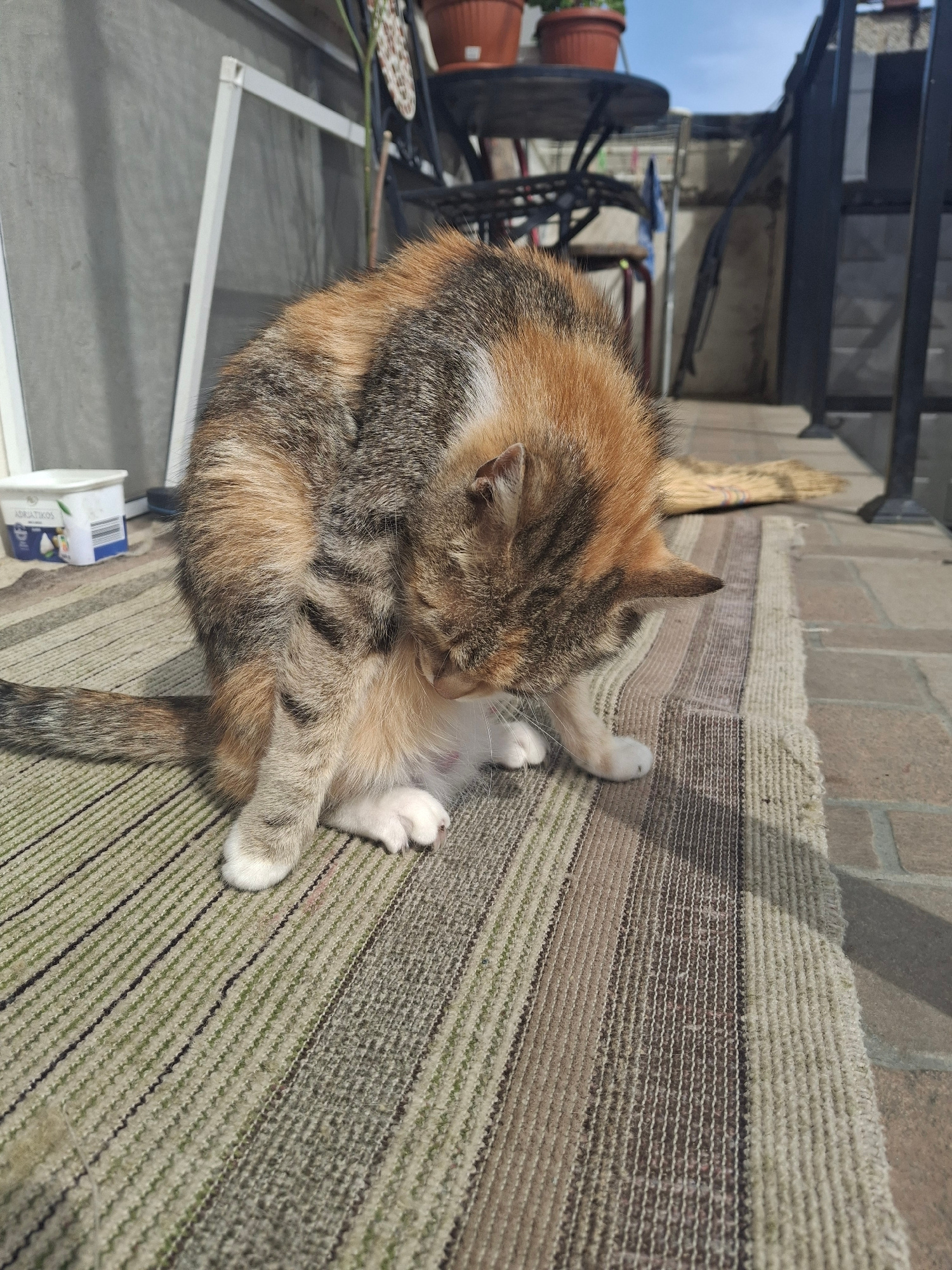 A medium shot of a calico cat licking itself while lying on a striped rug outdoors. The cat's fur is a mix of orange, brown, gray, and white. It is curled up in a ball, with its head bent down to lick…read more