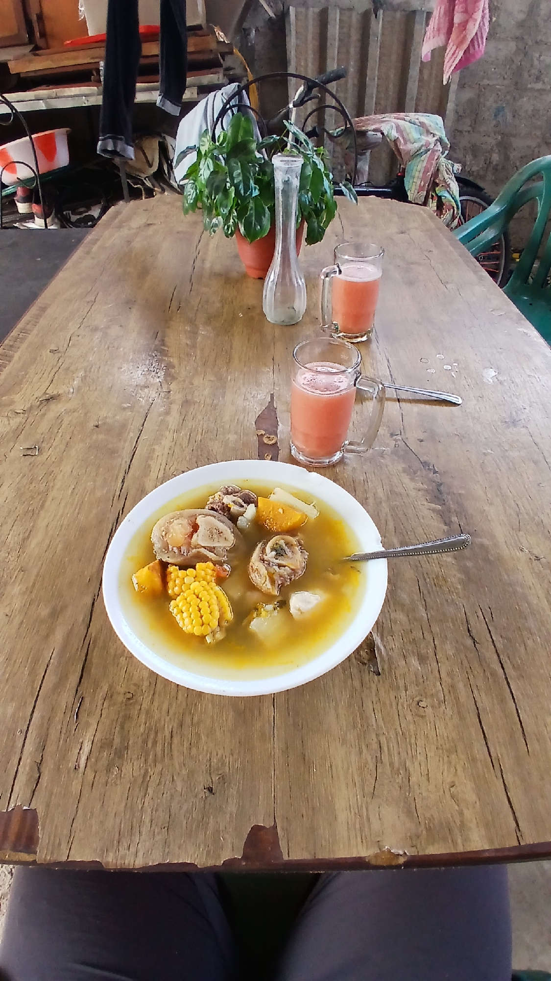 On a weathered wooden table, potentially outdoors given the background elements, a white bowl contains a broth-based soup. The soup includes identifiable ingredients such as corn on the cob, chunks of…read more