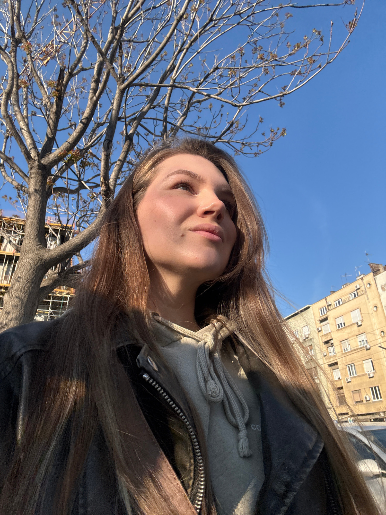 A young woman stands outside in Belgrade, Serbia. She is facing upward, with a leafless tree beside her. In the background, is a building with many windows. The sky is blue. The woman is wearing a gre…read more