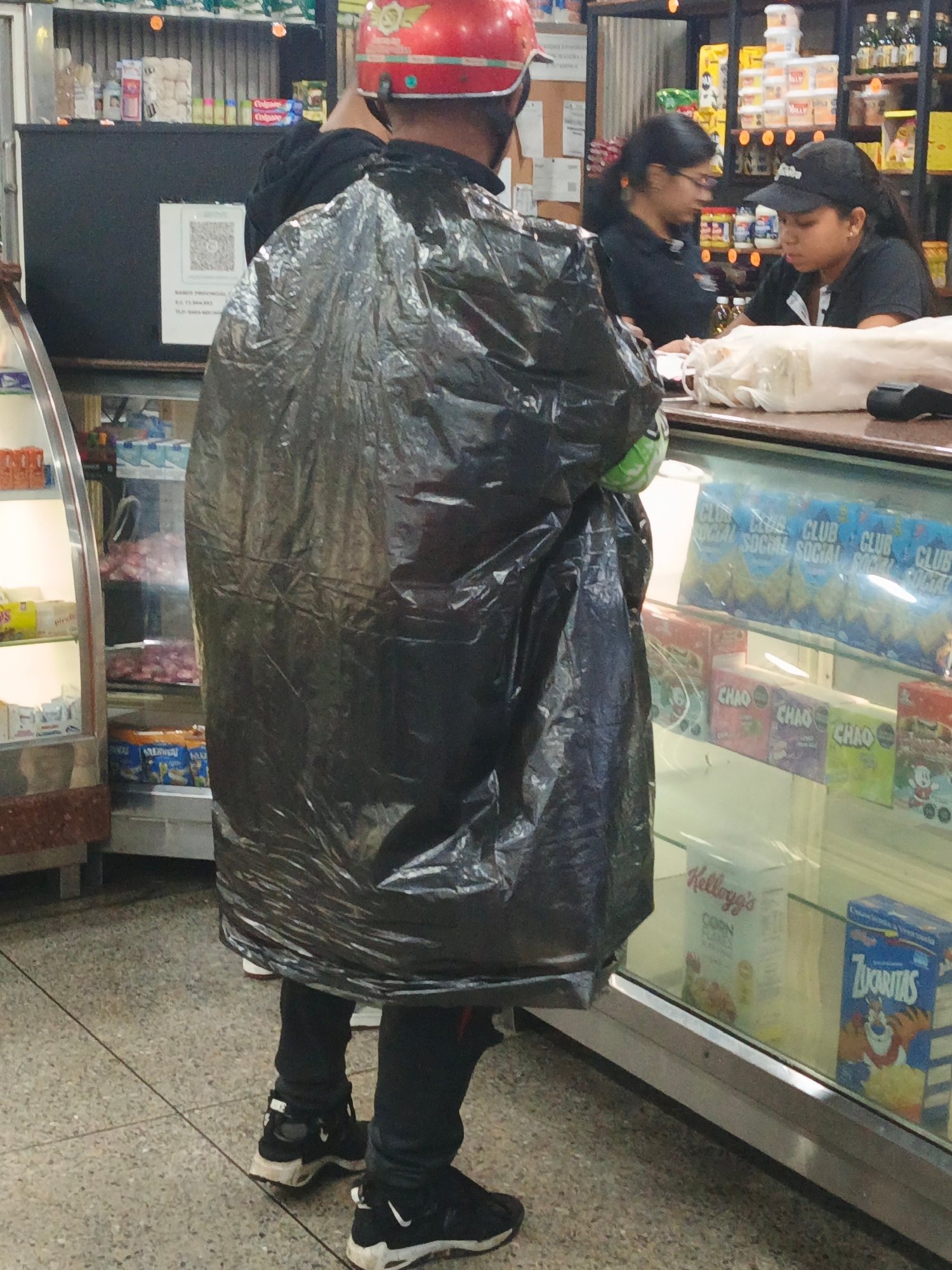 A person wearing a red motorcycle helmet and covered in a large black plastic bag stands facing a store counter. Two women stand behind the counter; one with glasses and another wearing a black baseba…read more