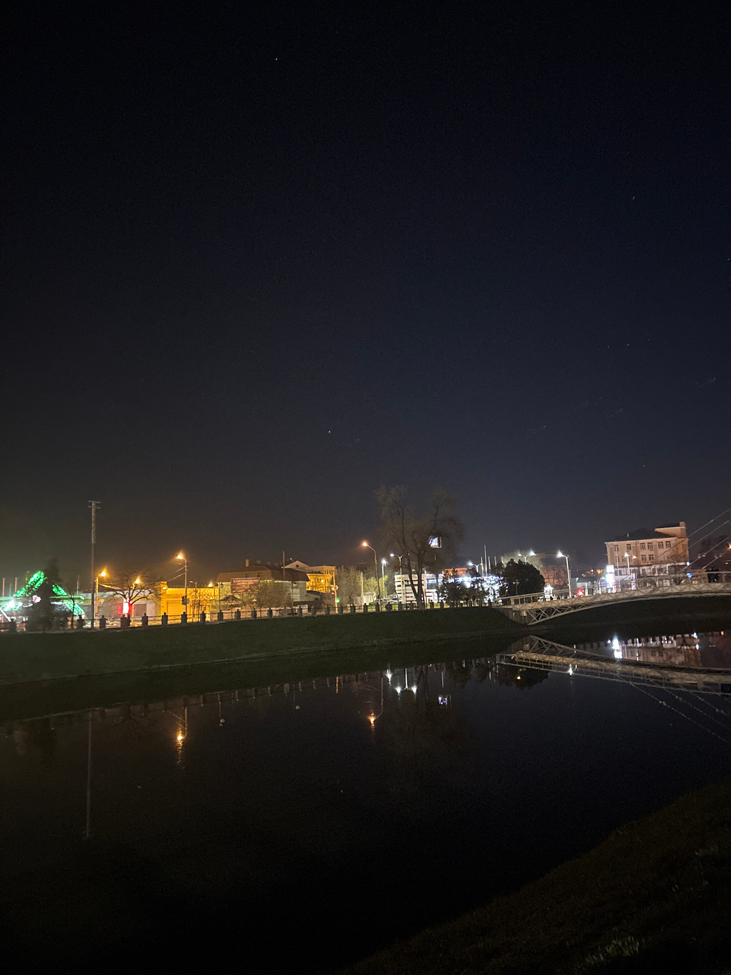 The image depicts a nighttime scene in Kharkiv, Ukraine, showing a row of buildings and streetlights along a waterfront reflected in the water. A bridge or elevated walkway is visible, partially obscu…read more