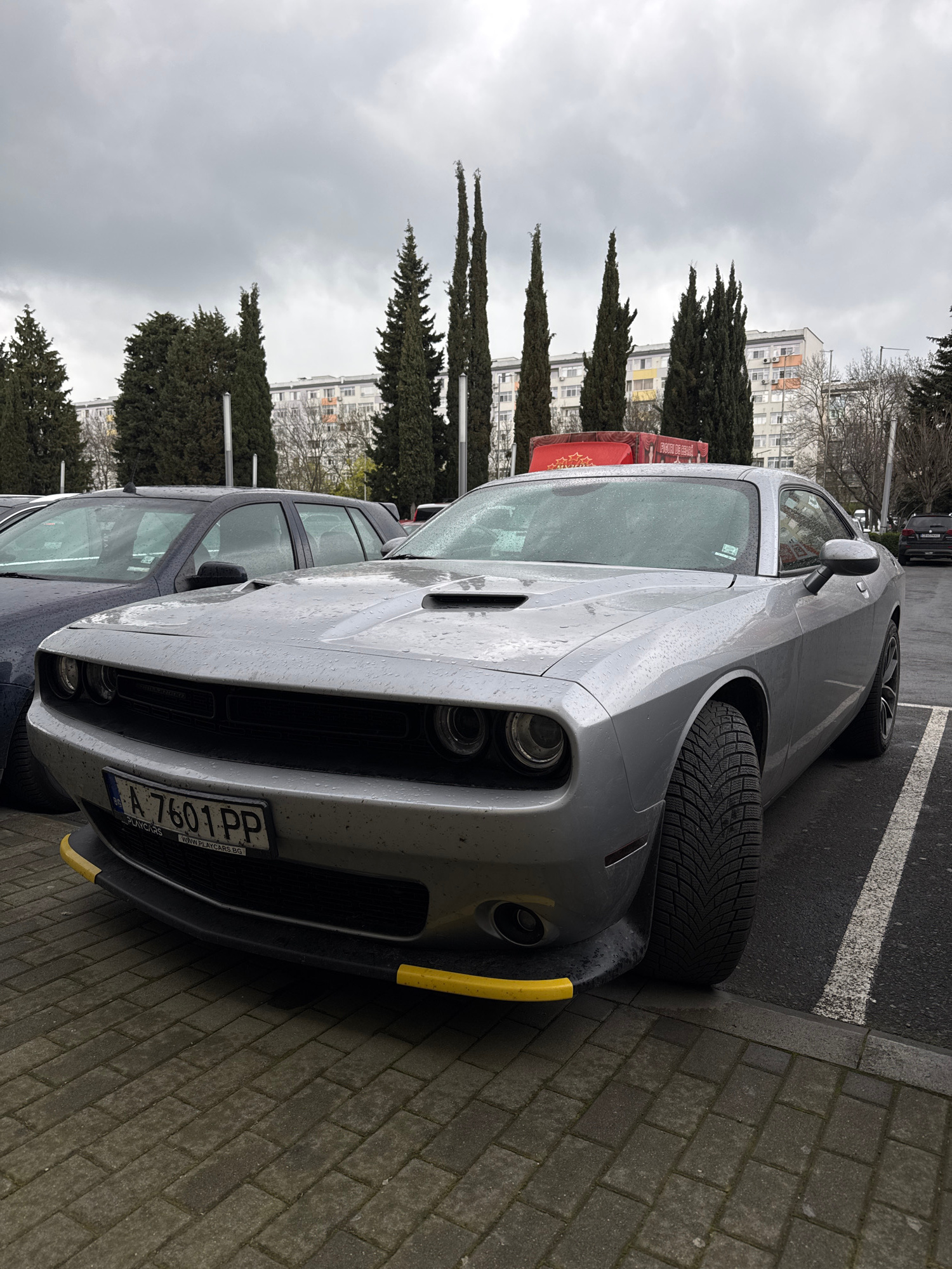 The image shows a silver Dodge Challenger parked on a brick sidewalk in Burgas, Bulgaria. The car is wet, suggesting recent rain. The license plate reads "A 7601 PP" and includes the website "WWW.PLAYβ¦read more