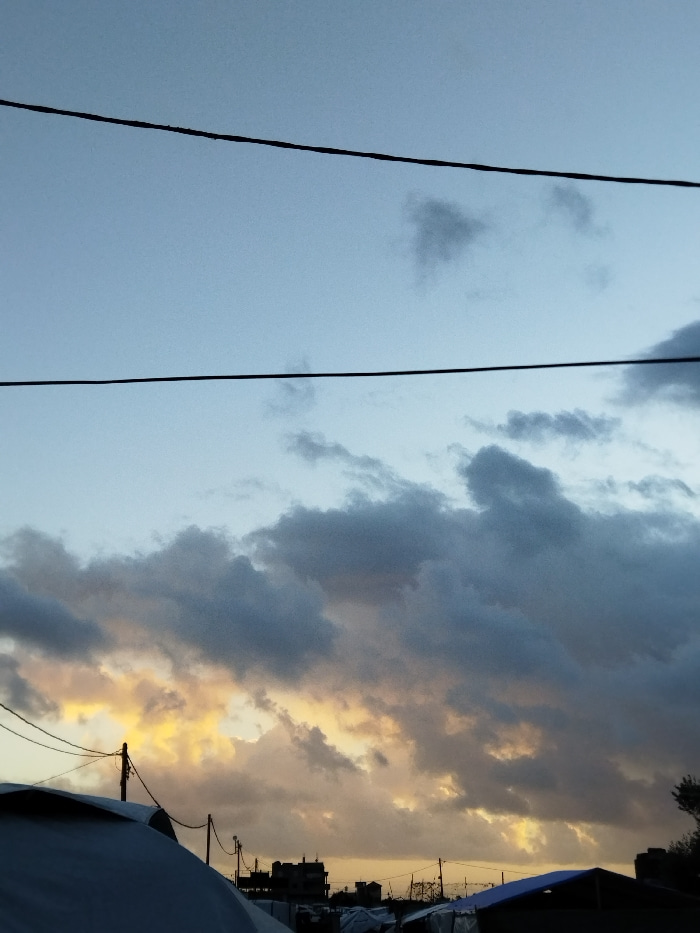 The image depicts a twilight scene over the city of Khan Yunis, Palestinian Territory. The sky occupies the majority of the frame, transitioning from a pale blue at the top to a dense formation of dar…read more