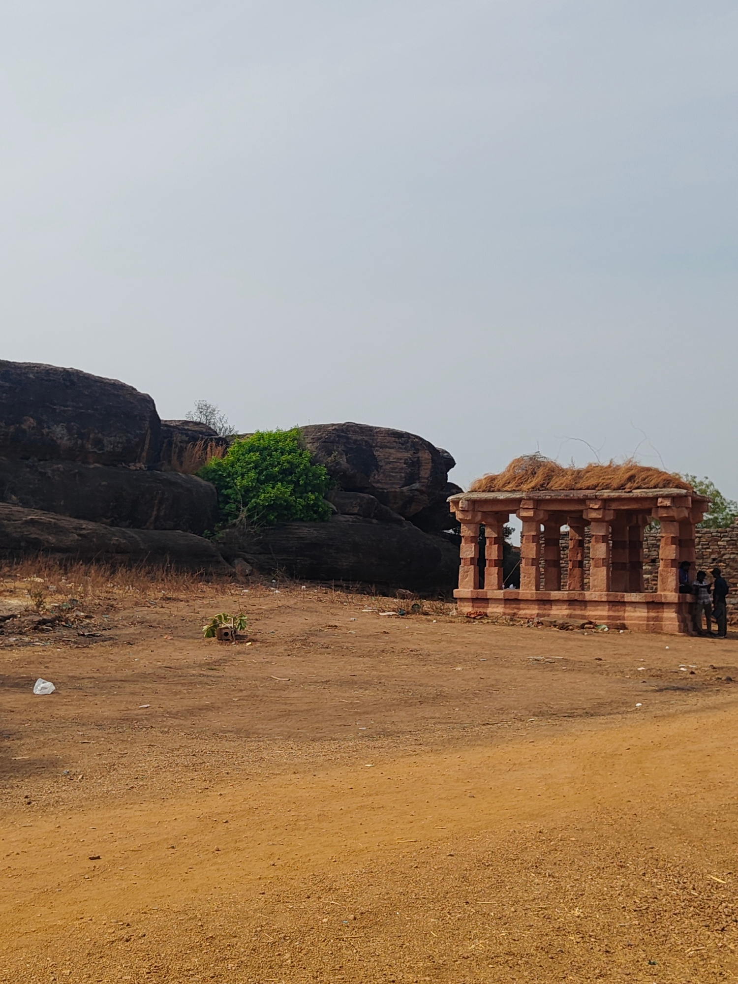 The image depicts a small, open, red sandstone pavilion-like structure in Vamasamudram, India. The structure has a straw-covered roof and is located on a reddish-brown, dusty, and barren landscape. To…read more