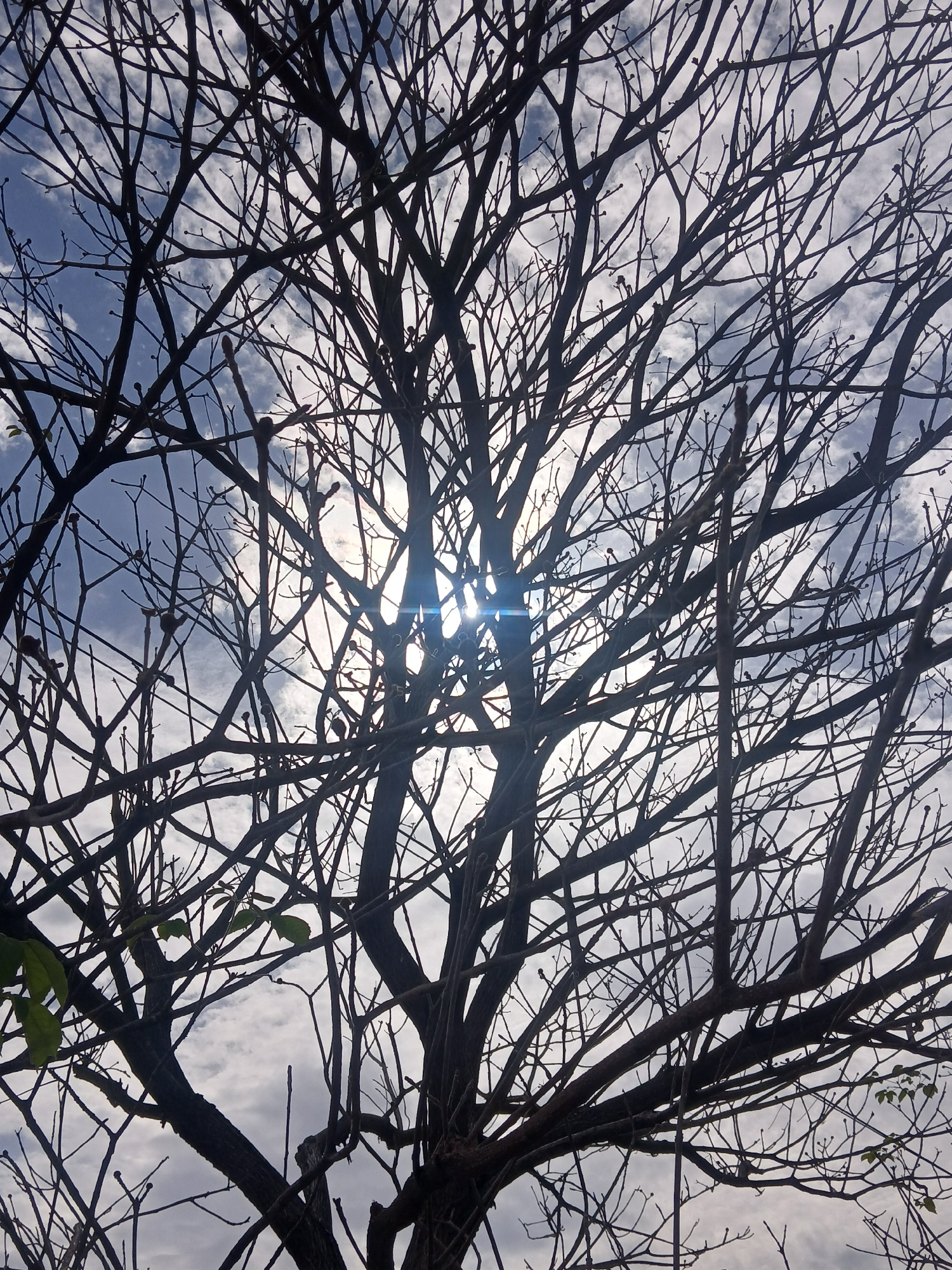 The image depicts a view looking up into the branches of a tree, silhouetted against a sky with scattered clouds. Sunlight is visible through the gaps in the branches. The tree appears to be mostly ba…read more