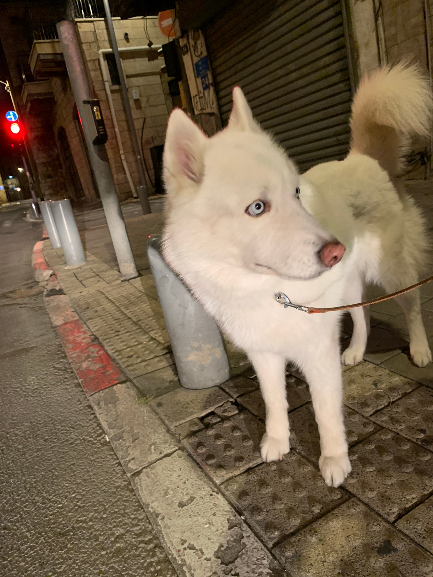 A white husky is leashed to a utility pole on a sidewalk in Tel Aviv, Israel. The sidewalk is made of textured concrete pavers. A red and white curb is visible. A street and traffic lights are in the…read more