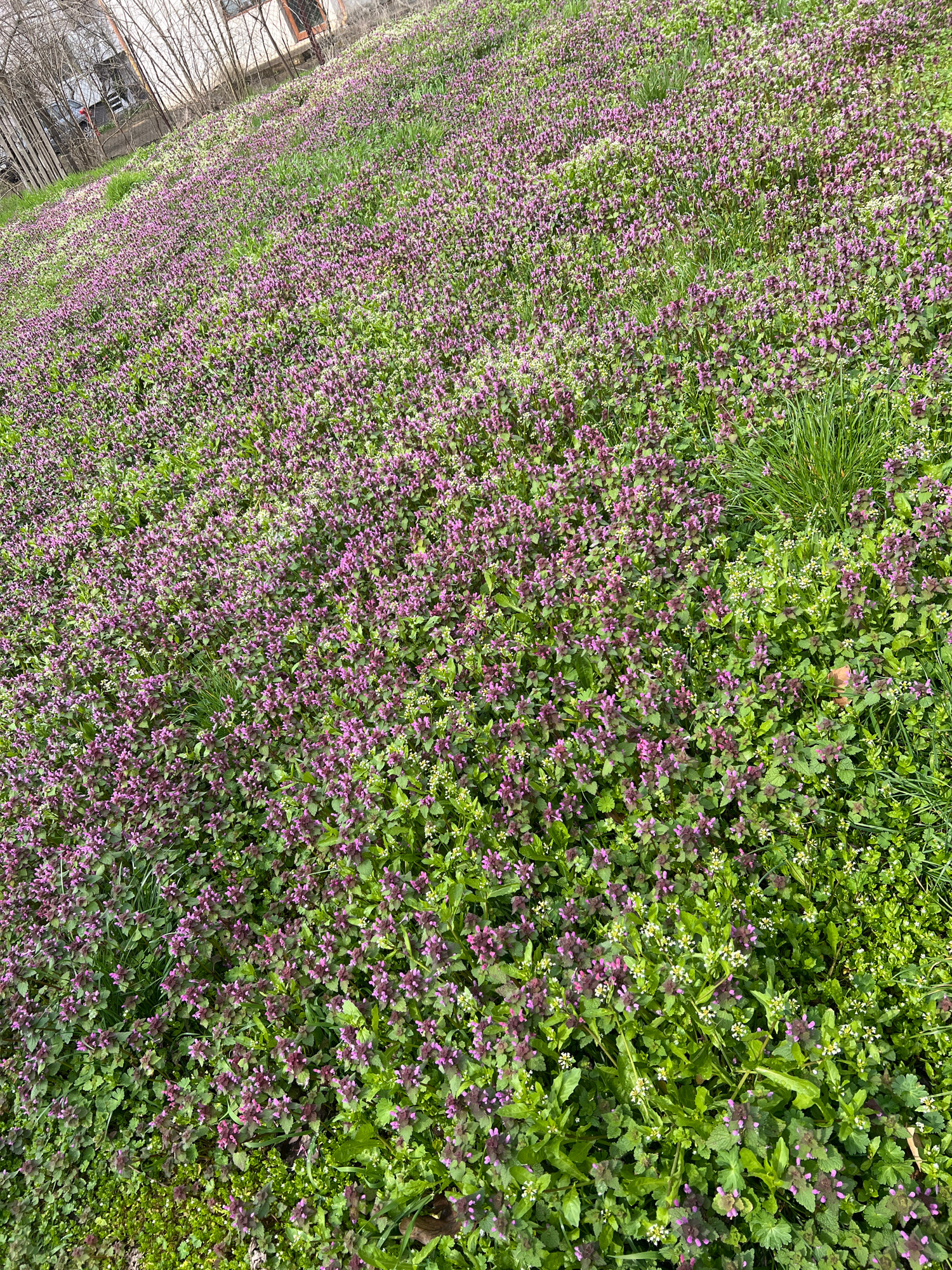 The image shows a dense ground cover of purple deadnettle (Lamium purpureum) and possibly some other low-growing plants, like common chickweed (Stellaria media). The ground cover extends across a larg…read more