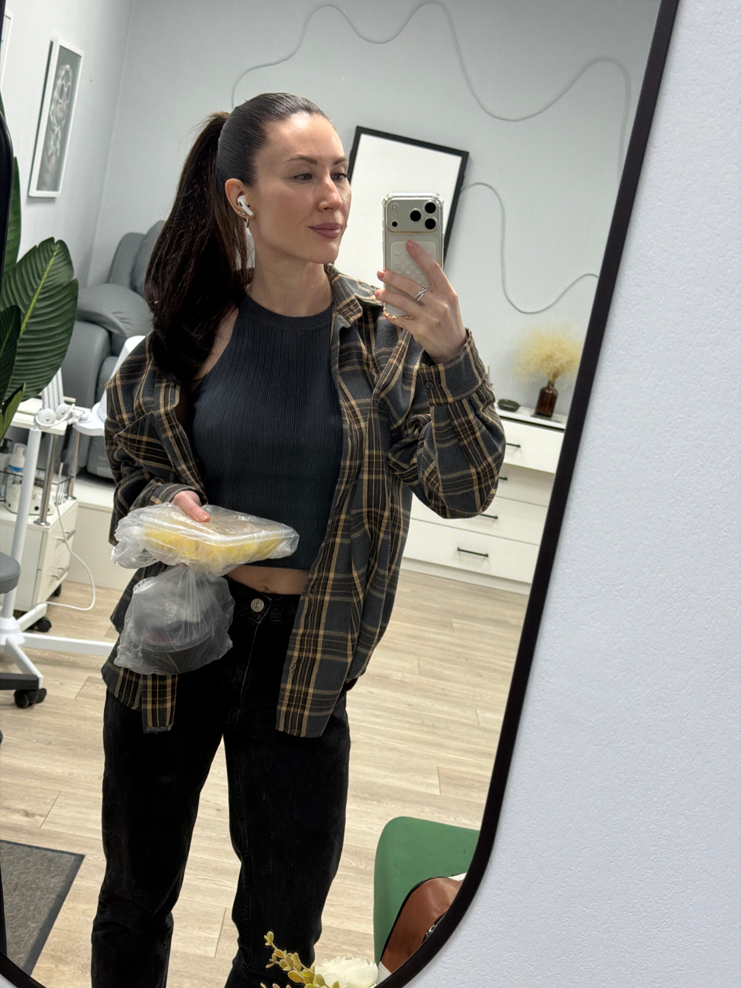 A woman is taking a selfie in a mirror. She is wearing a gray ribbed top, black jeans, and a gray and brown plaid flannel shirt. She is holding two plastic bags, one containing what appears to be food…read more