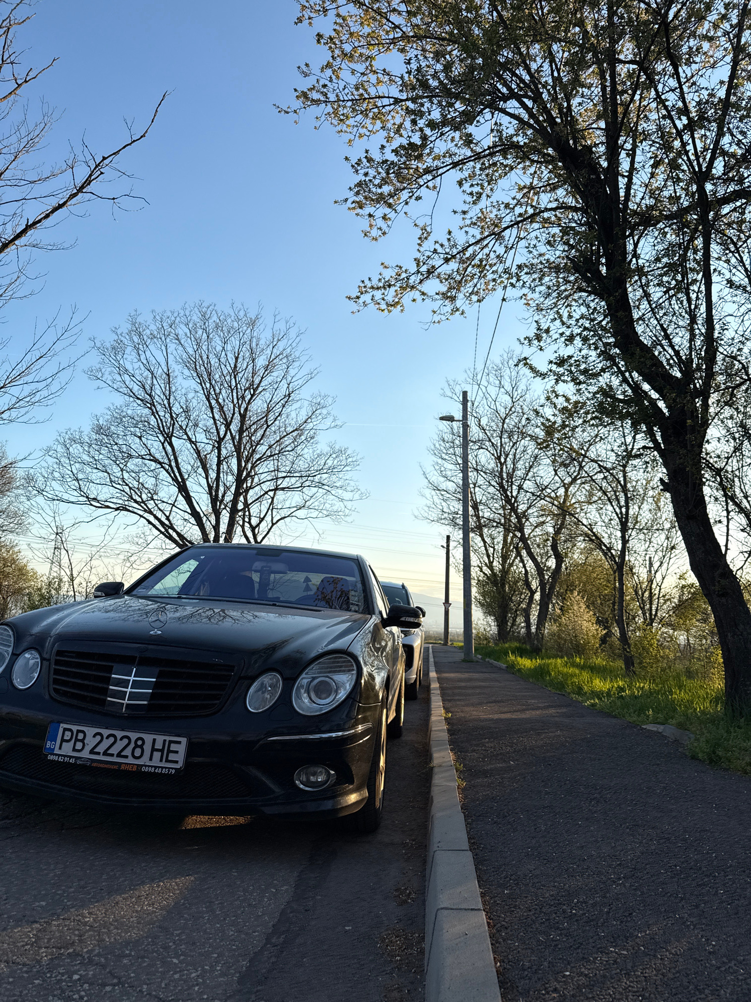 The image shows a black Mercedes-Benz parked on the side of a road in Buhovo, Bulgaria. The car's license plate reads "PB 2228 HE." The vehicle is parked next to a curb, with trees lining the opposite…read more